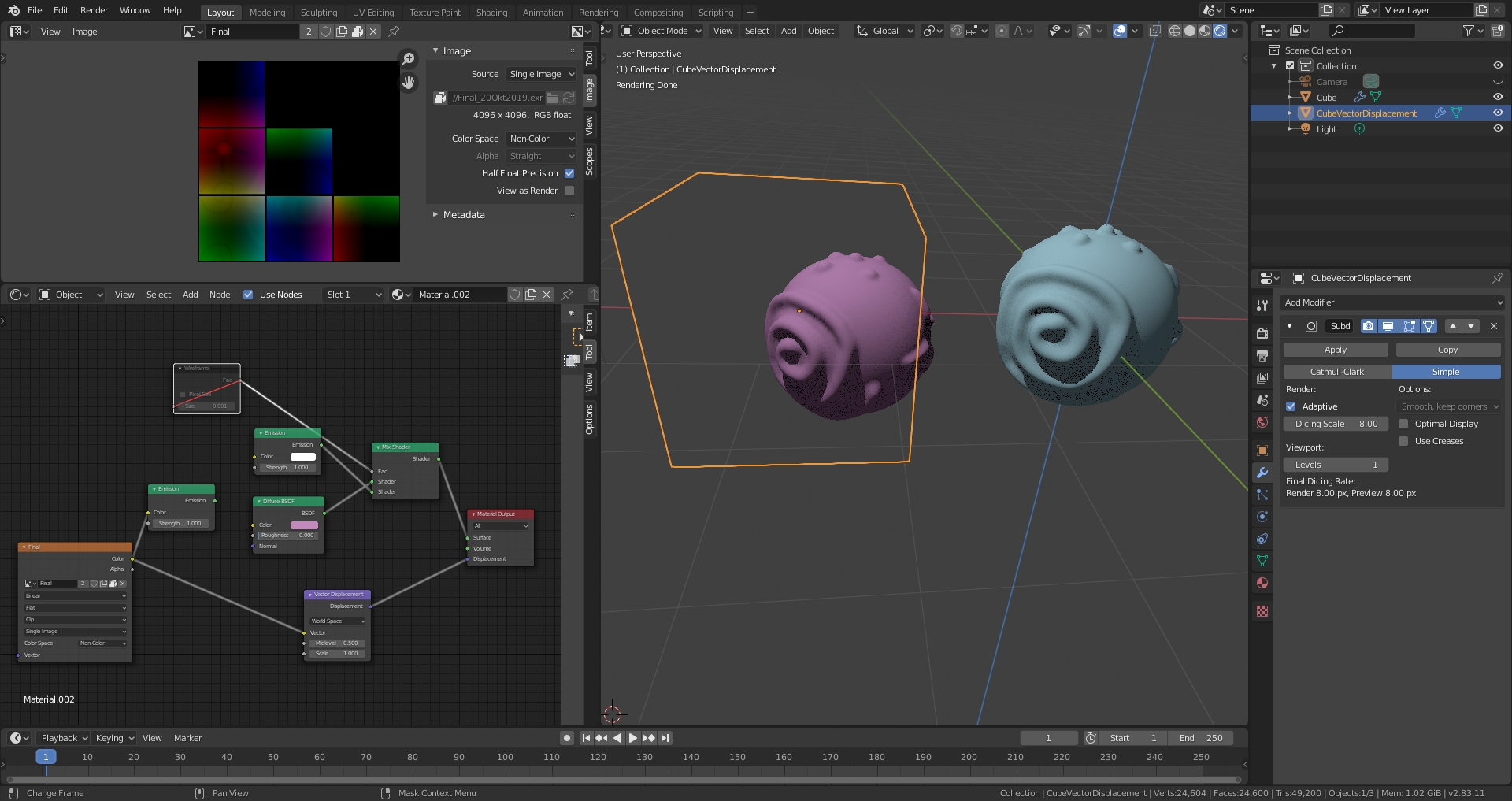 spikeyxxx This is currently the "easiest" way of creating a "Vector Displacement Map" in Blender as far as I know it. The key element is the "Multires Modifier" which you turn off before baking the map for the unsubdivided mesh primitive and which you turn on (showing your sculpted details on a higher "Multires" subdivision level) before baking the map for your target map. The "Multires Modifier" keeps the UV map of your original mesh primitive intact even with the sculpted details beeing visible when the "Multires Modifier" is active. The difference of both UV map is your vector displacement map.