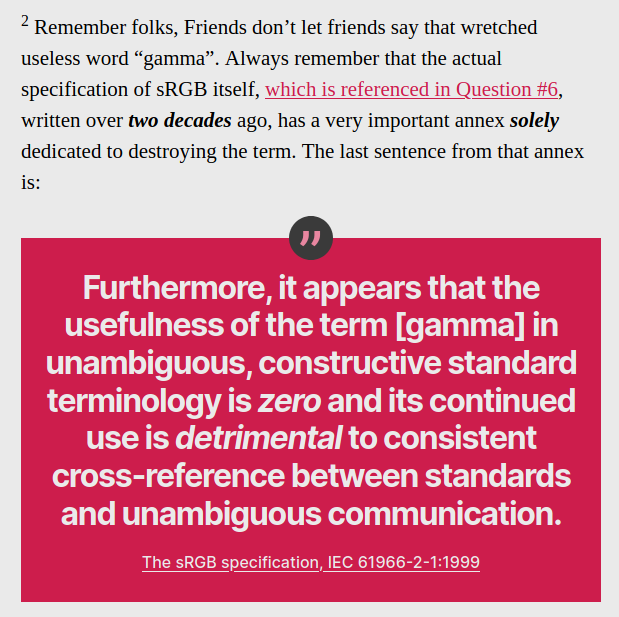 spikeyxxx The term "gamma" is obviously used in a variety of contexts in mathematics and science as can be seen for example here (probably not a complete list and not the best source but just for demonstration purposes). Therefore a proper definition is crucial. In terms of image processing and manipulation, I understand "gamma" as the manipulation of pixel brightness (I know this term also needs proper defintion in order to dinstinguish it to "Value", "Luminosity", "Luminance" etc.) which not only reflects the characteristic response of early cathode ray tube (CRT) monitors to input voltages (non-linear) but also the sensitivity of the human eye to slight differences in brigthness which is better in the lower range of brightness values (compare a small candle light in a dark room and the same light in broad dayligth on a sunny day) than in the higher range. Therefore it makes sense to bring pixels with slight brightness differences in the higher range of brightness values to the same brightness value so that the image can be more compressed in that range which leaves memory space the darke pixels so that slight brightness differences can be saved in the file which our eyes are able to perceive.