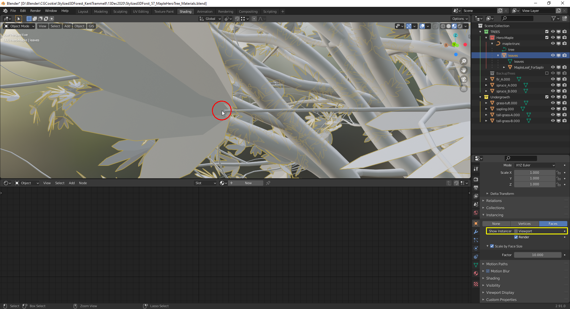 The visibility of the faces that serve as "Instancers" for the duplication of the "Maple Leaf" at the tree branches can be turned off:
