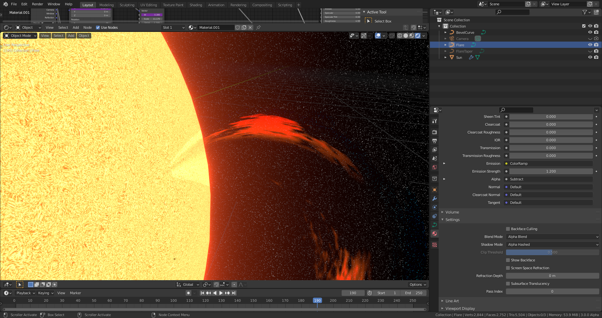 In order to protect the grainy sun surface from beeing "erased" at both ends of the sun flare I had to switch the "Blende Mode" for the sun flare material from "Alpha Blend" to "Alpha Hashed" and crank up the number of samples significantly in order to approximate to the look of "Alpha Blend":