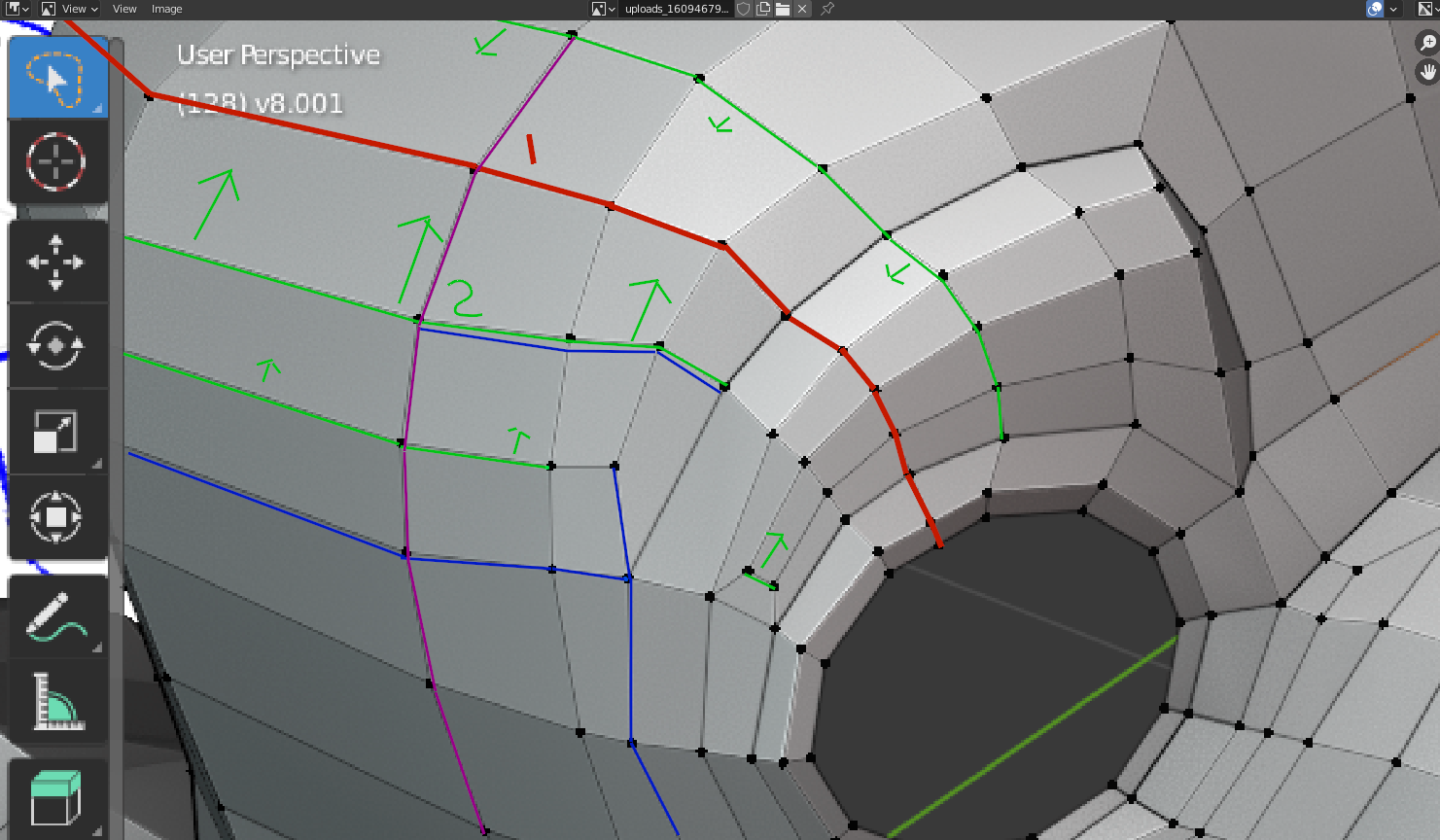 2 space the edge loops to close the gap left from removing edge 1, leaving consistent spacing across the top and down the side of the head.