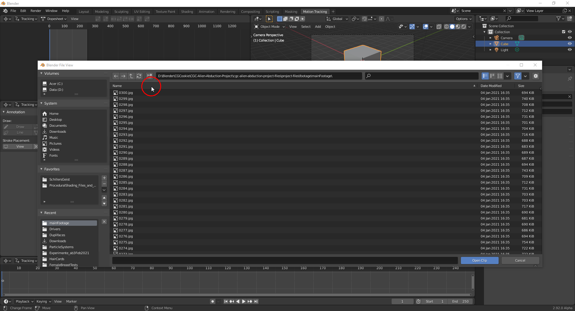 When loading an image sequence to the "Movie Clip Editor", click on the first image that you want to load (in our case here at "0001.jpg" and then on "Open Clip":