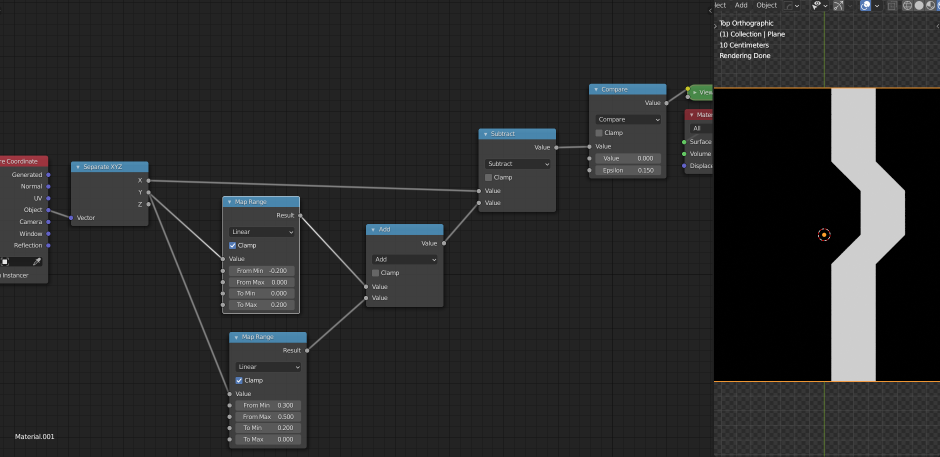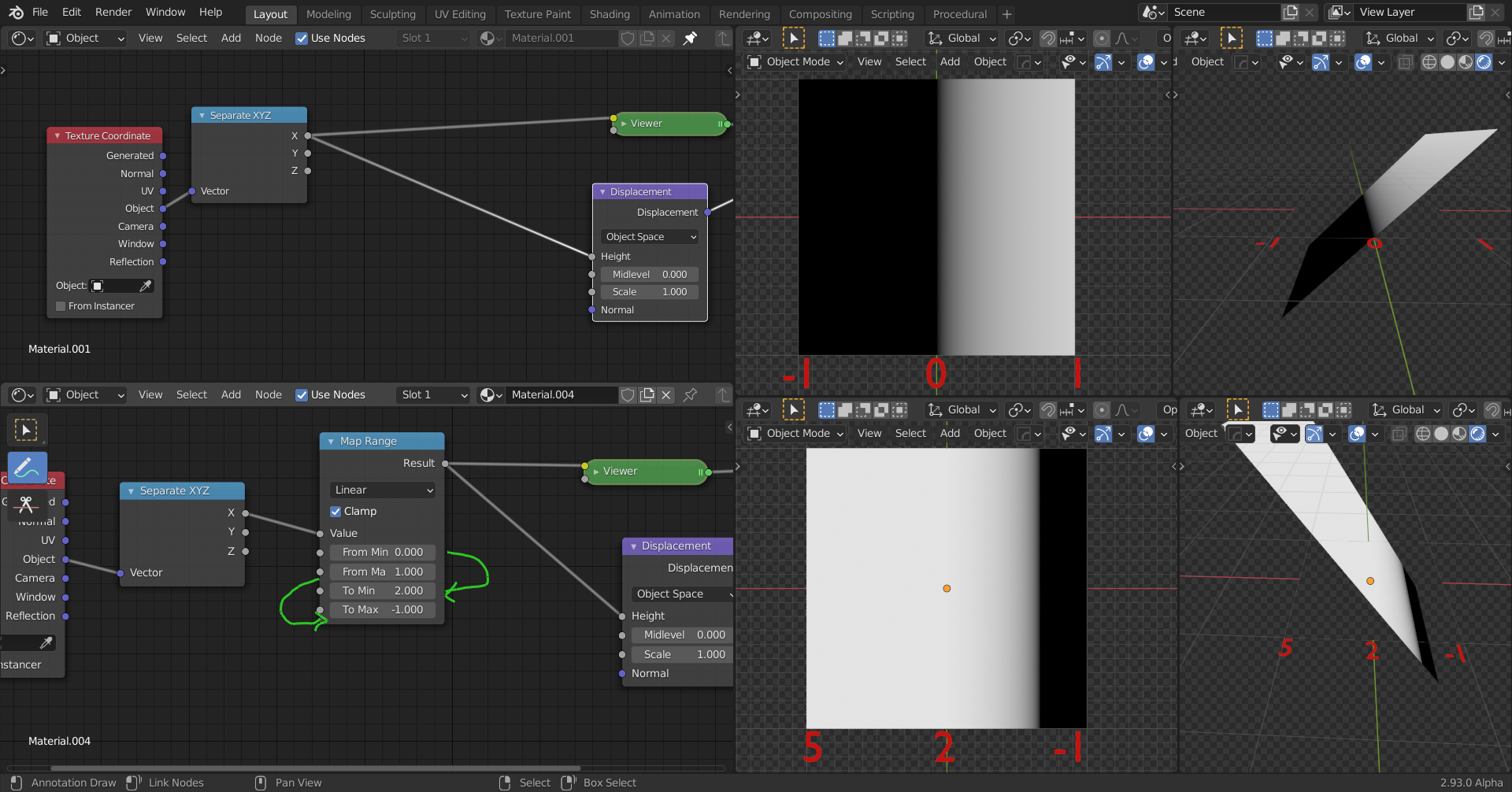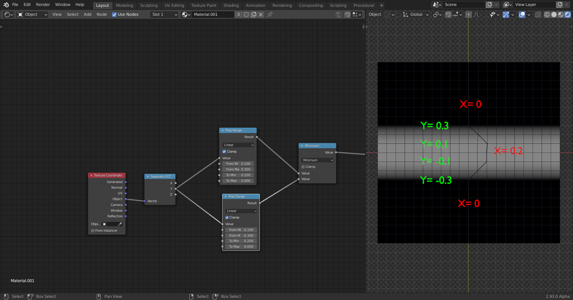 spikeyxxx So, the original interval is stretched or squeezed (just the values that are attributed to the suface points which keep their positions within the mesh) and the direction for rising values can be switched as well (with "To Min" set to a greater value than "To Max" while "From Min" being lower than "From Max"). "From Min" (should be better named "From Start") is mapped to "To Min" (better ("To Start") and "From Max" (better ("From End") is mapped to "To Max" (better "To End"). The "Input Value" in the "Map Range Node" directly above "From Min" is recalculated taking care of the interval stretching/squeezing and, if any, also the direction switching for rising values.