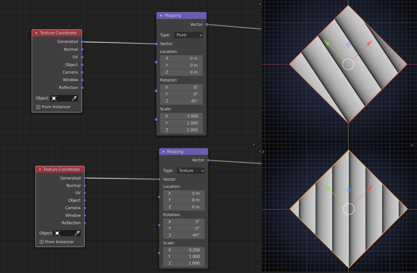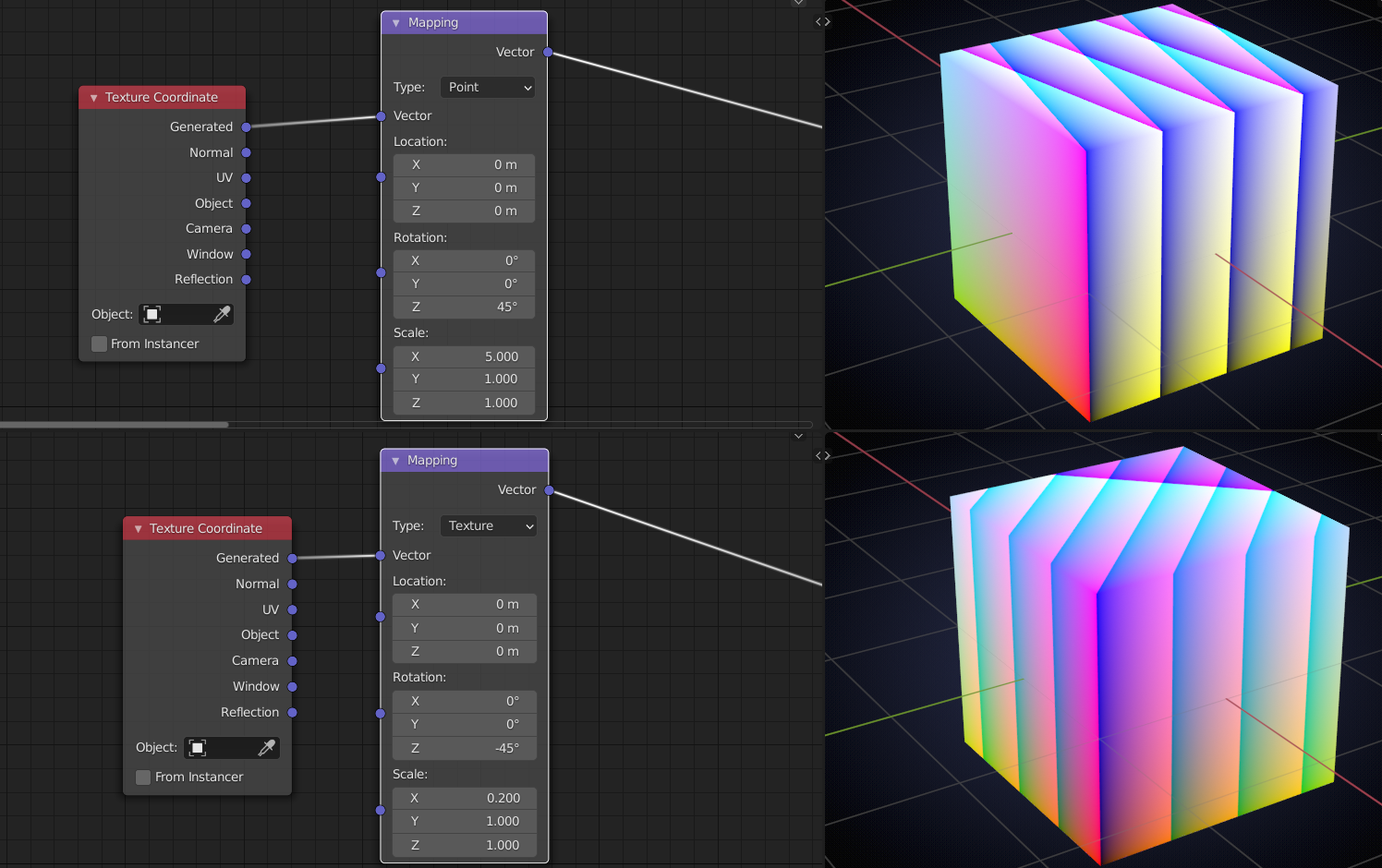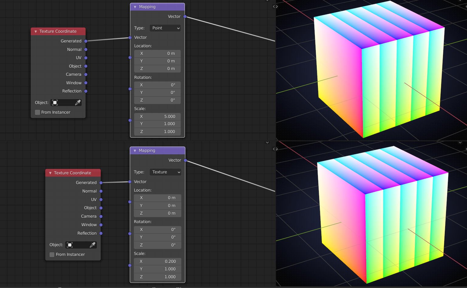 Point has scaled first along the Cube's X-axis and then rotated. Texture has first rotated and then scaled along the rotated X-axis.