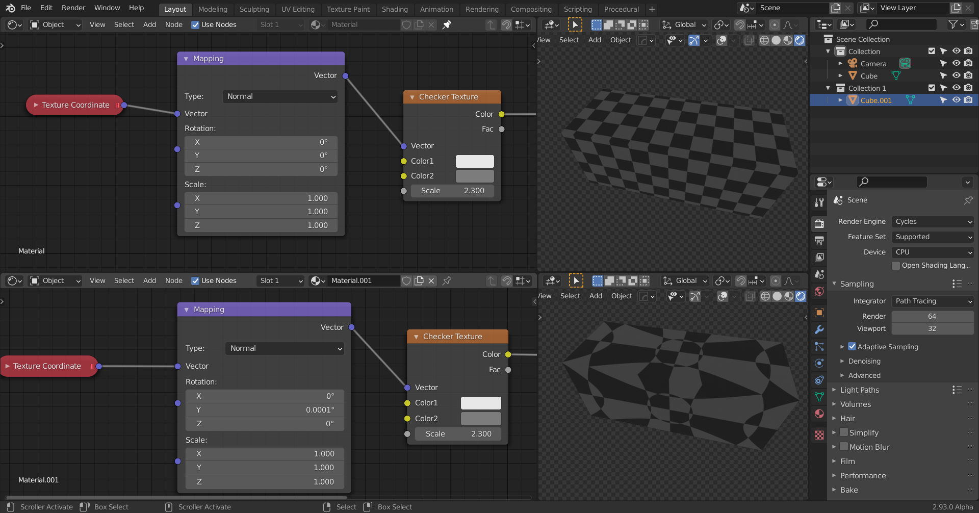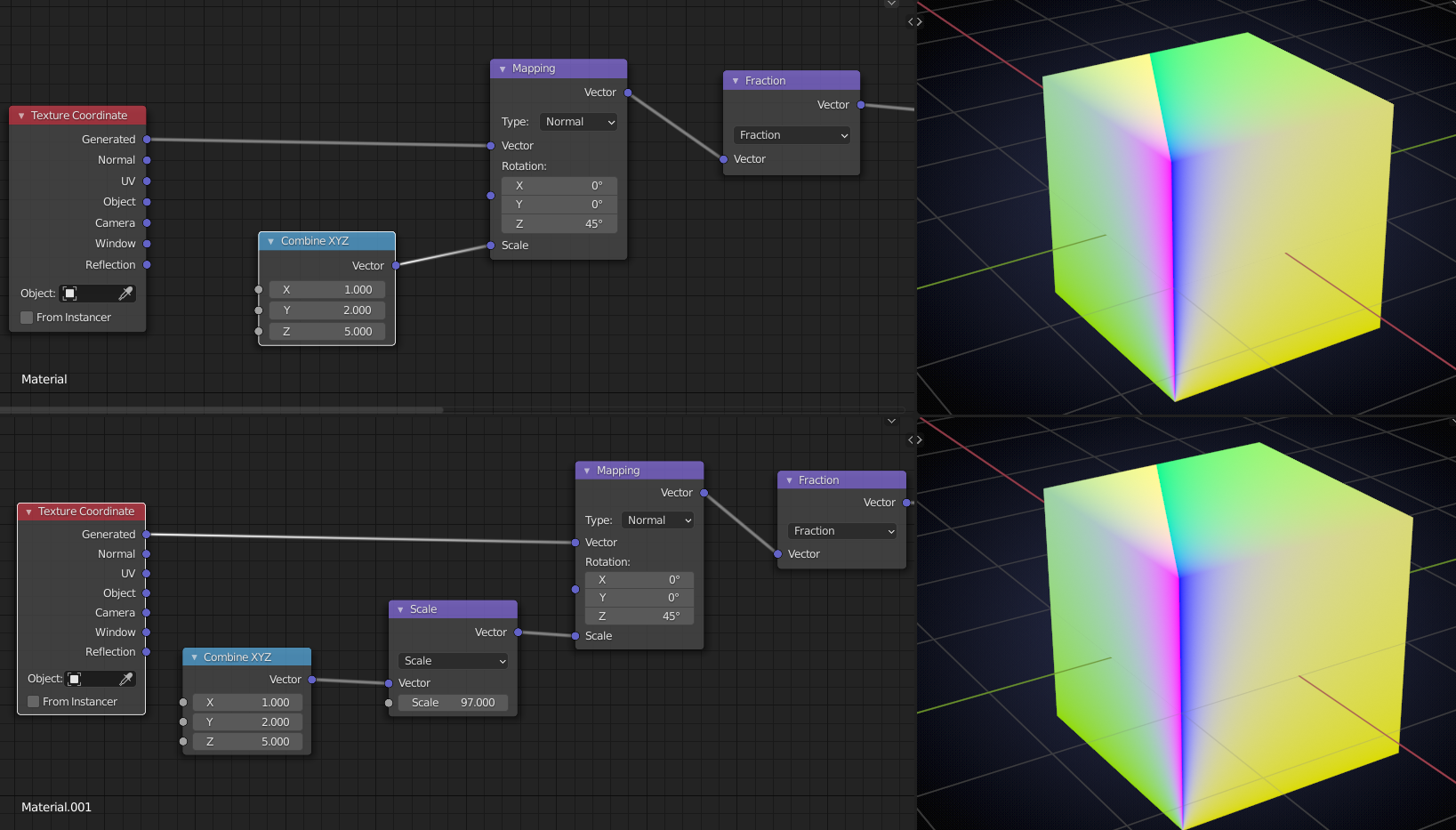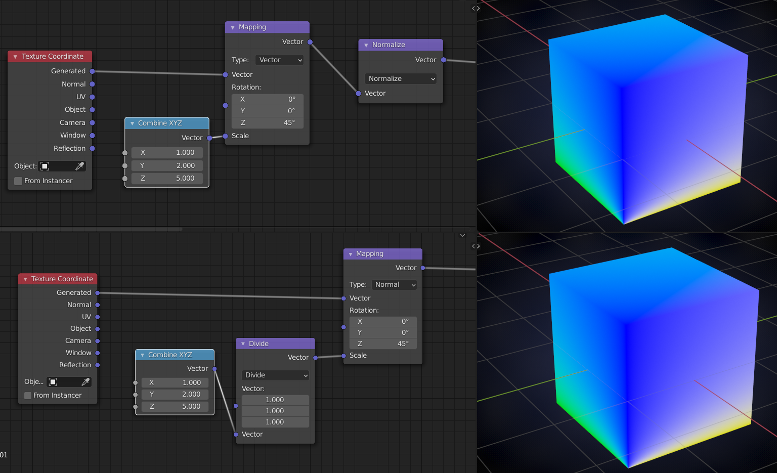 Point has scaled first along the Cube's X-axis and then rotated. Texture has first rotated and then scaled along the rotated X-axis.