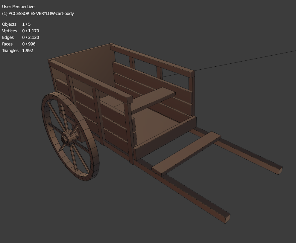 Some additional work, first I tried to reduce the vertex count on the low poly mesh a bit - thinnking that maybe the detail for the back of the car could be done by texturing, so I changed the planks to a single block of wood, but can change back once we know where exactly this will be used in the shot.