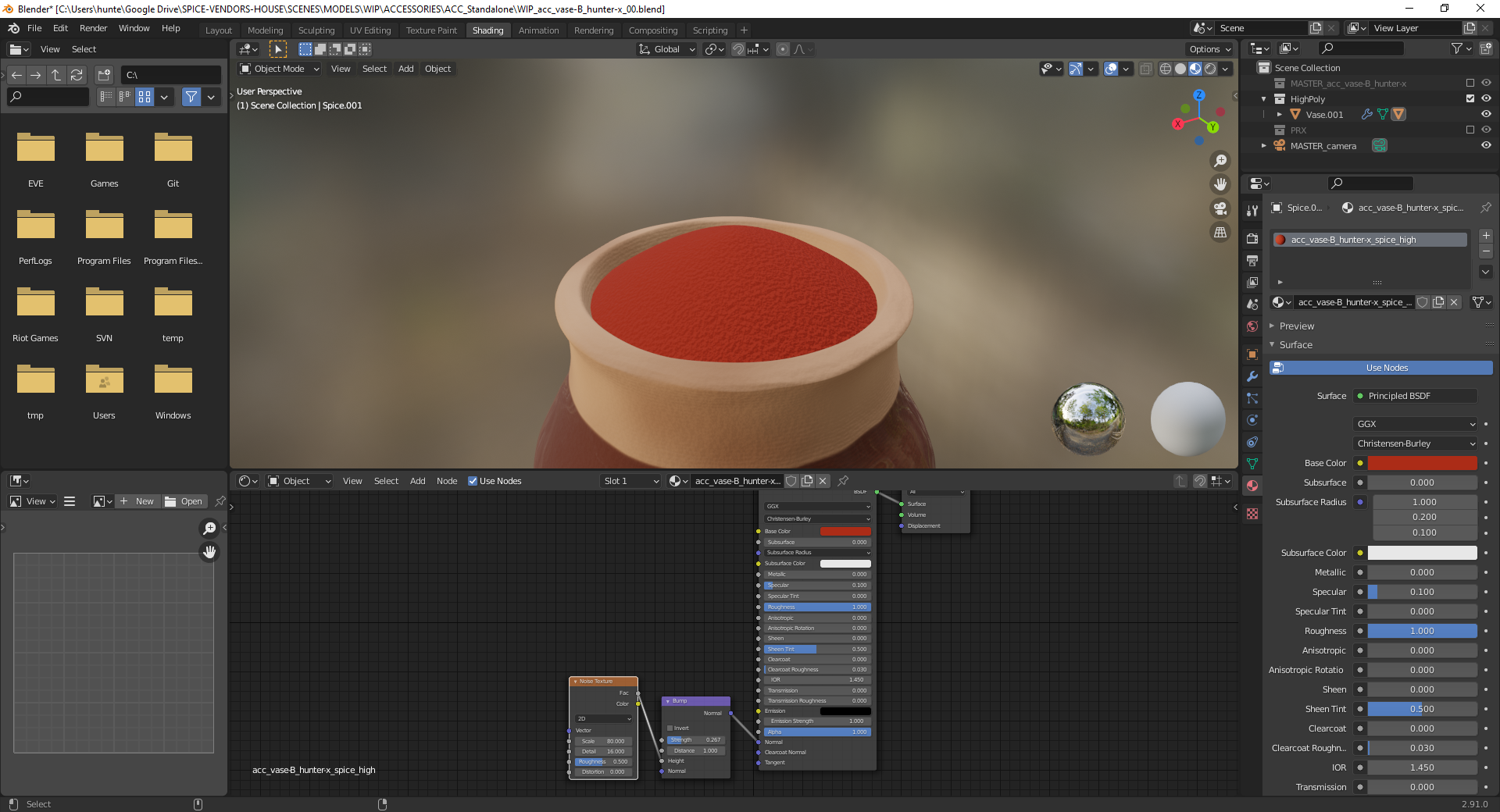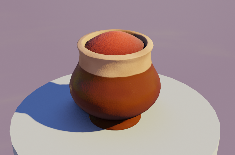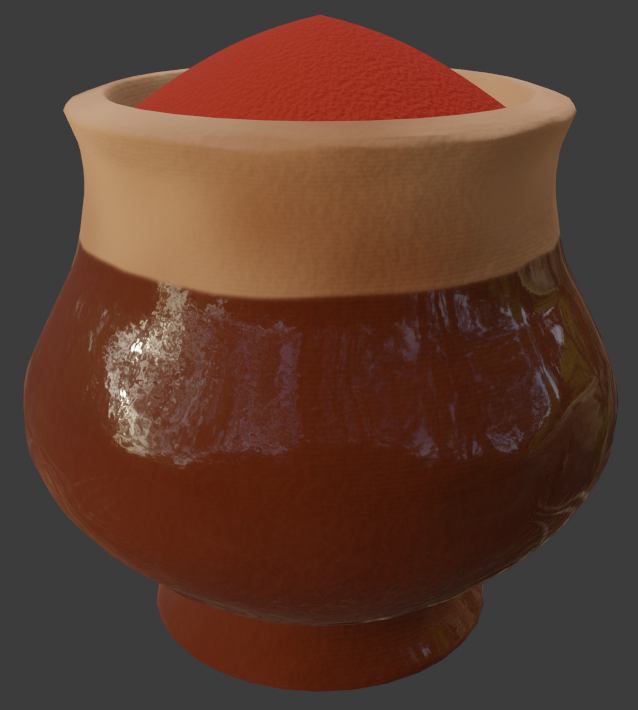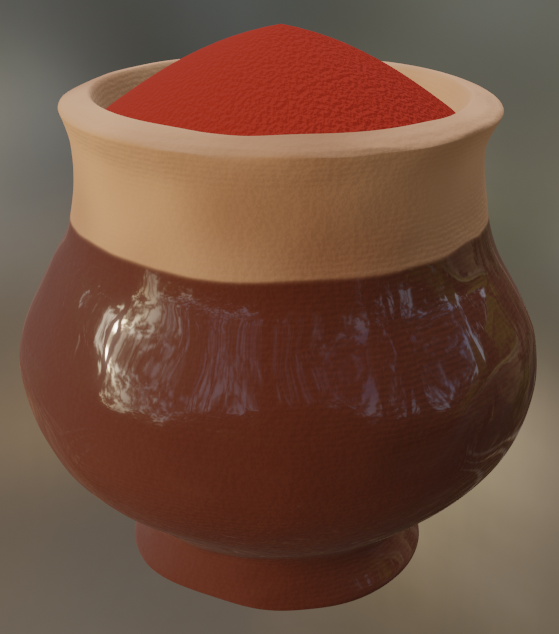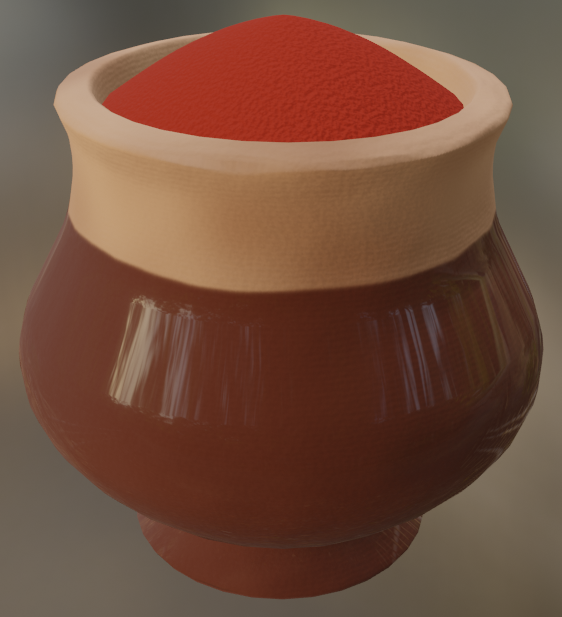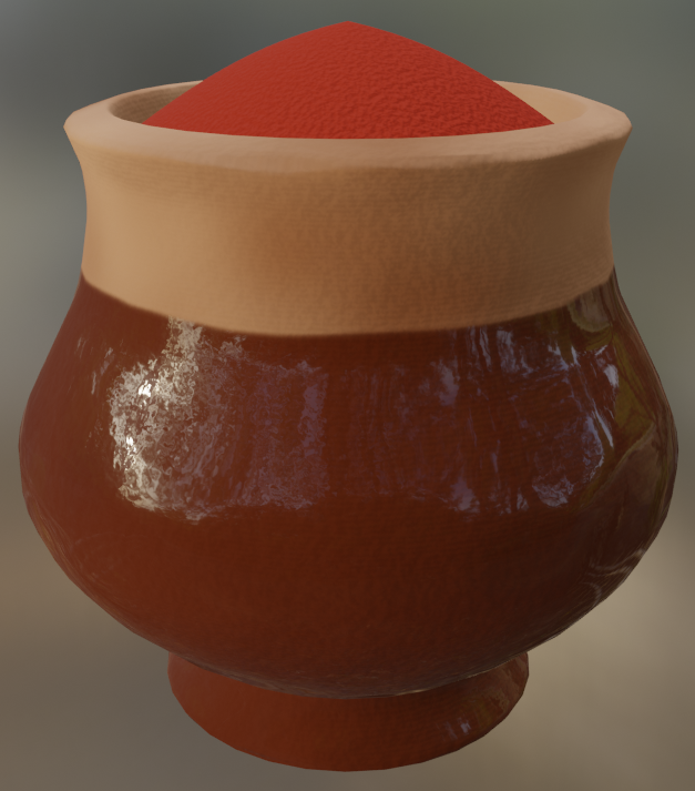 I had a look through your tweaks to the model; I'd experimented with using Roughness for the glaze after seeing a couple of the other vases use it but decided I preferred the way Clearcoat produced a smooth layer on top of the rough surface of the clay (with Roughness it clings a bit too tightly to the surface of the vase for my taste if that makes sense). That said, as project lead you of course have final say on the way the models are presented in the scene itself :) Out of curiosity, was the change more of a stylistic thing or are there performance considerations when using Clearcoat? The changes to the spice look good though and help make the edges stand out a bit more.