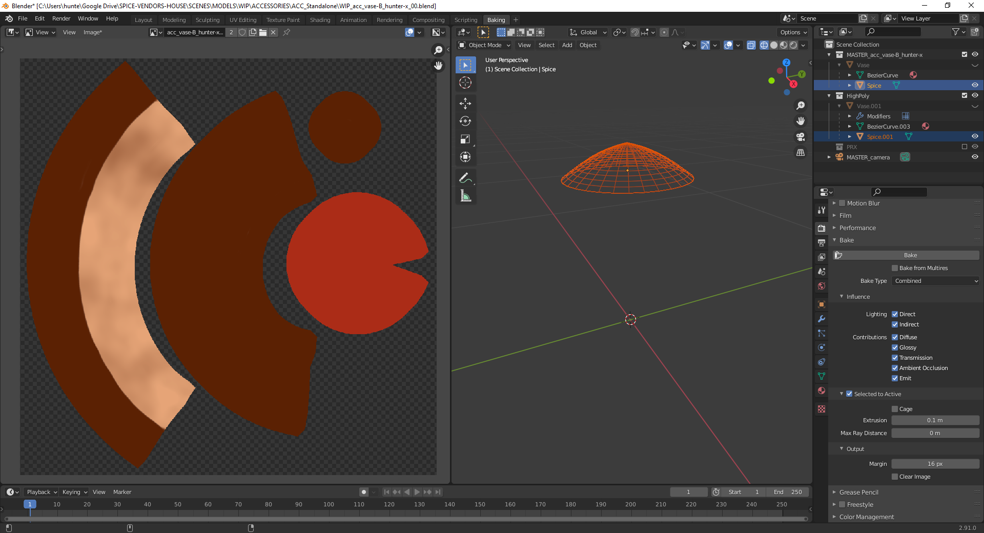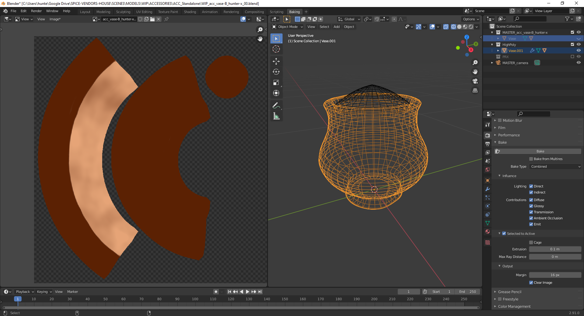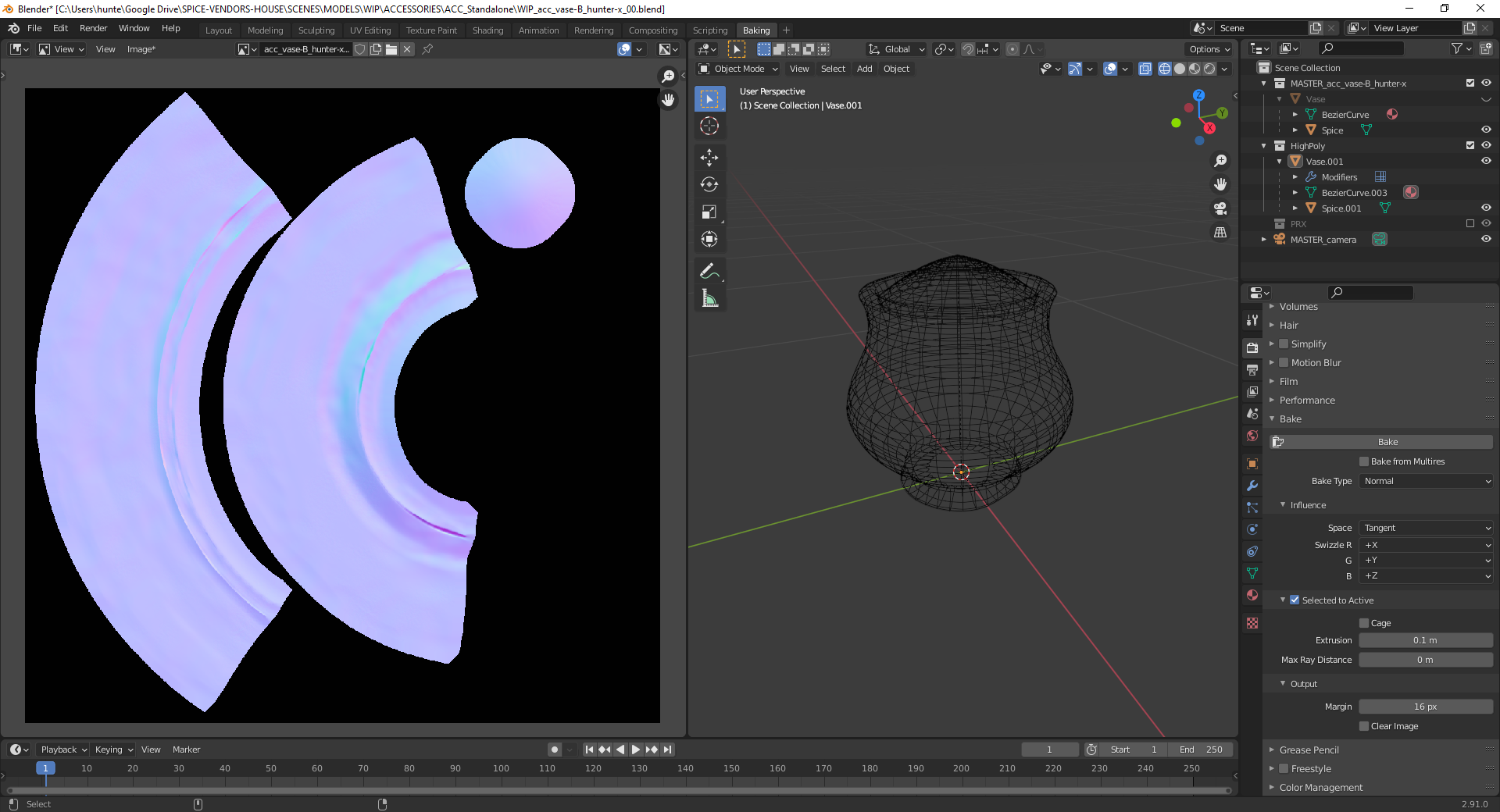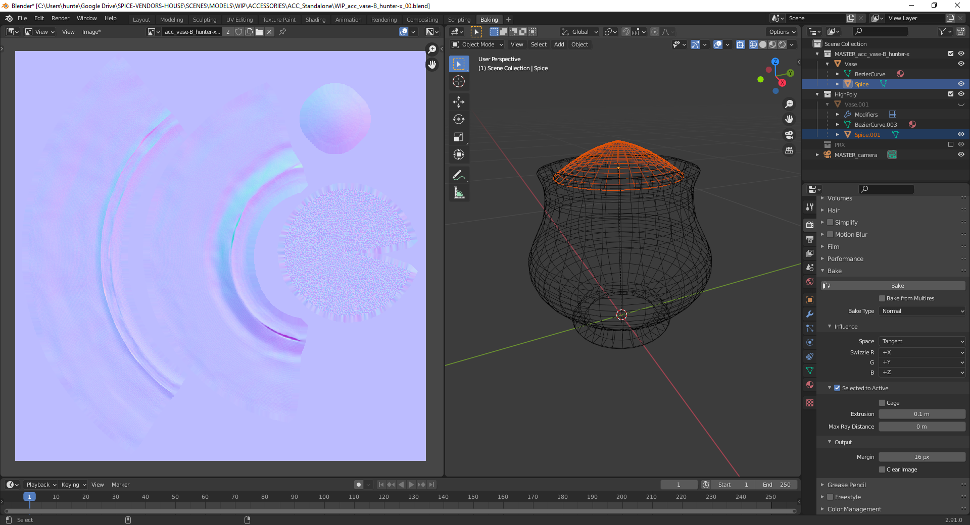 Today's work involved taking the current state of my high-poly vase and baking it onto the low poly version: