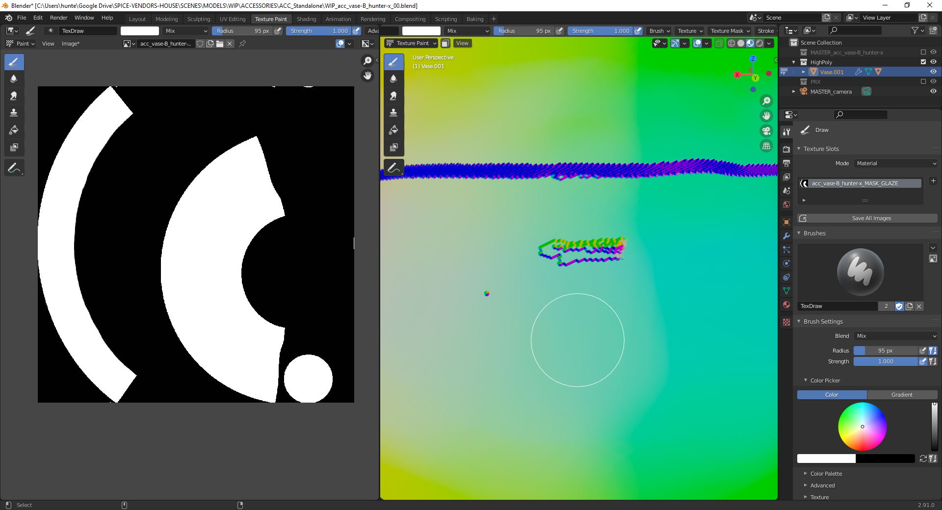 Next up I hooked up an image texture to a MixRGB node and the shader's Clearcoat value to produce a glaze effect, then texture-painted a mask to apply it to the lower half of the model.