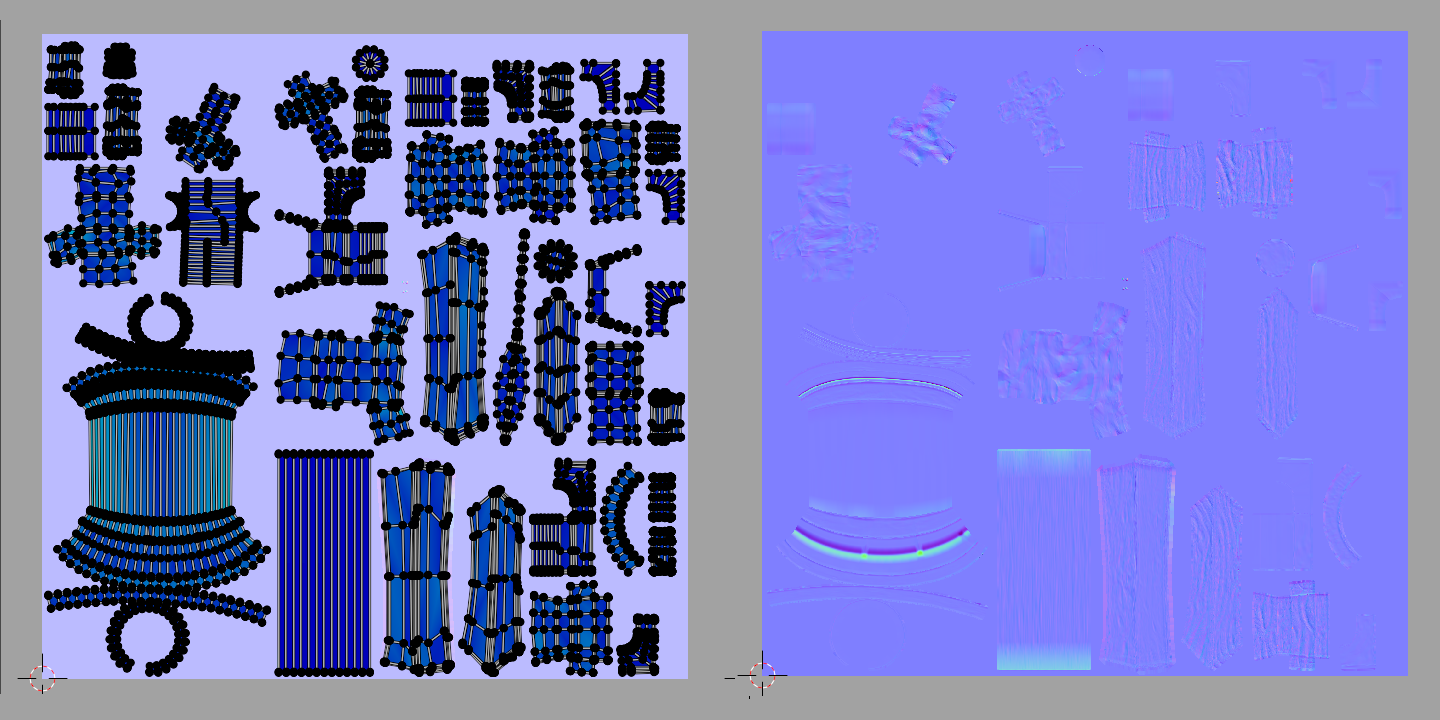 Everything is unwrapped, and I'm baking as I go to see how things look as normal maps. I figured it would help me decide what elements need to be redone after my first sculpt pass.
