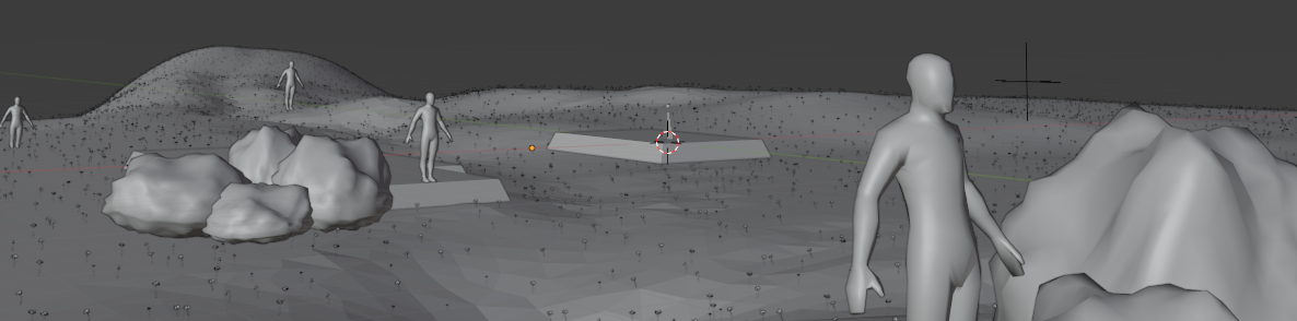 My current idea is to use weight painting for populating the ground plane just on the spots where we need it to be populated. So you basically place everything else and then simply paint grass in where needed. Combined with some Ground Texture this could be a solution at least in my head.