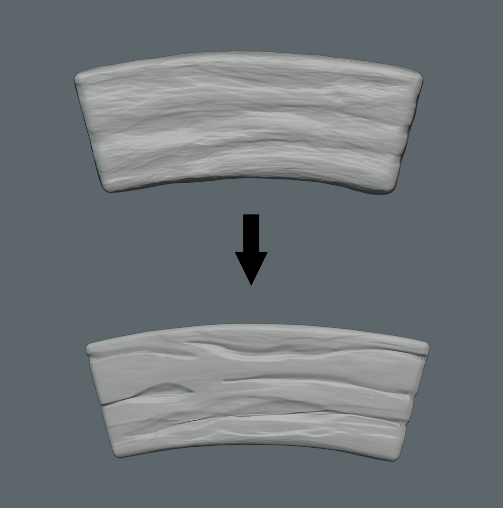 I'm sculpting and experimenting with making the wood creases. I made a custom brush so you can create a crease more sharp at the start. If anyone is interested I can share it.