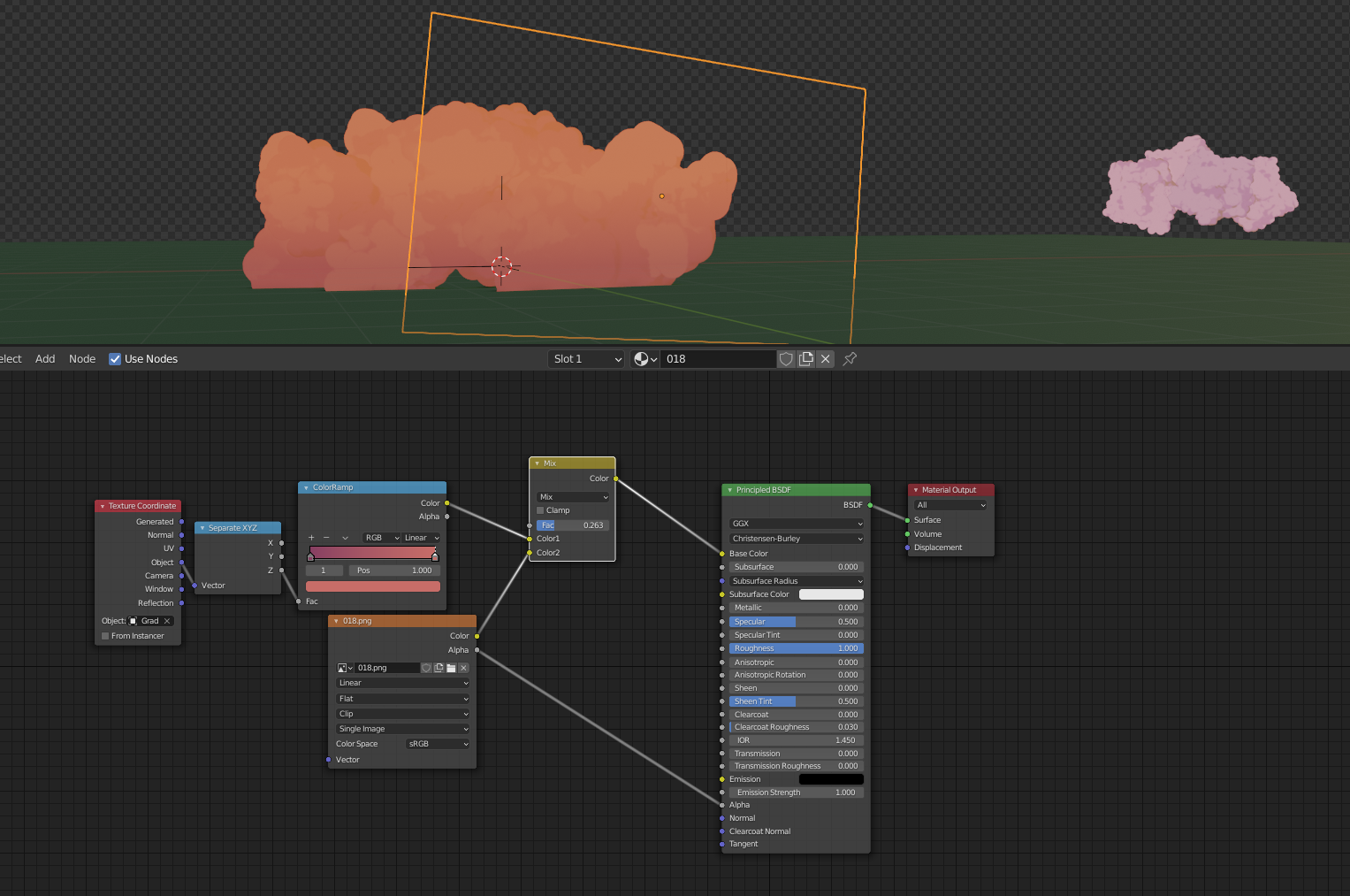Also, I set up a gradient control in the material. I figure the PNGs can be used for the luma only, and hue-shifted for different bushes like green and blue-ish ones. And then the gradient can also be tweaked to give more variation.