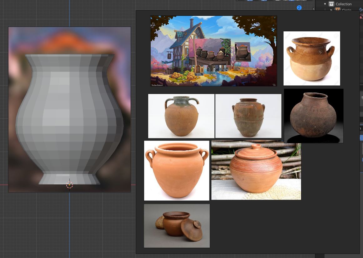 I know this is a tiny piece of the puzzle, but I am determined to make the best out of it. I've got a basic mesh done for the vase C, but I am not sure what to do in the case of the material. At first it seems like the vase is made out of 2 parts (bottom brown one and the top light brown), but when I think about the way it is made, the only logical solution is that it is painted. now do I solve it with texturing at the end or modelling the 2 separate surfaces?