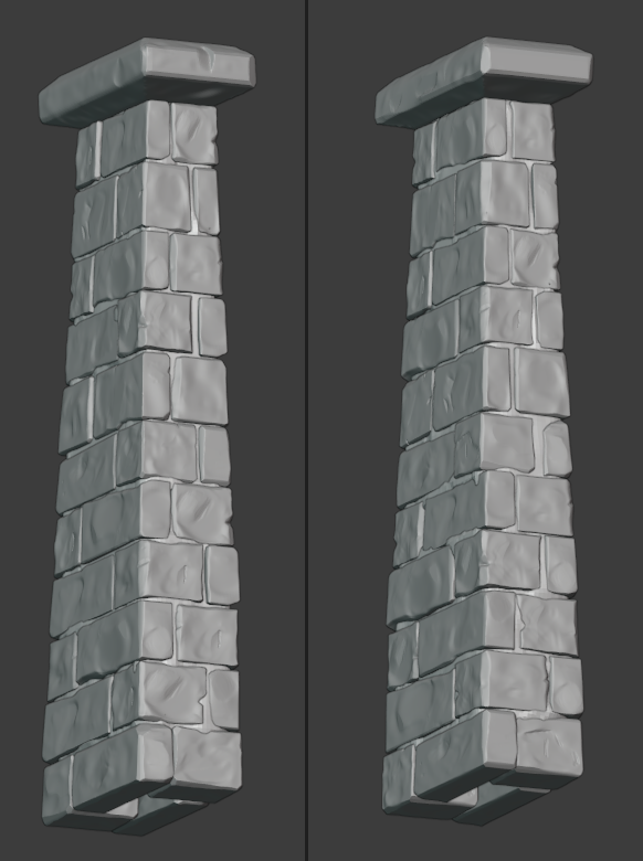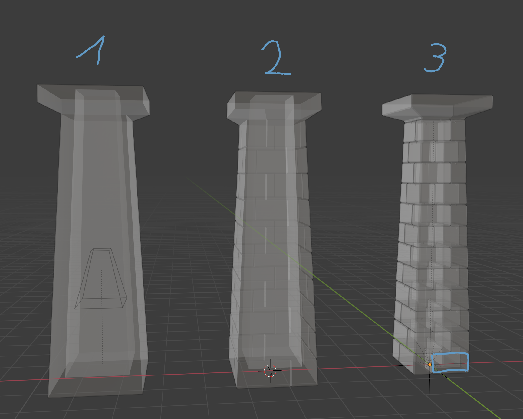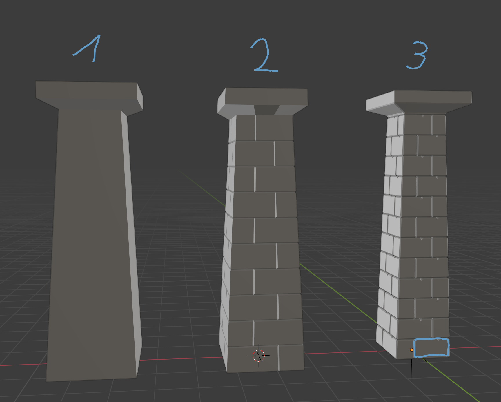 Since the idea is that most of us will be baking a high poly model onto the lo poly version. I personally think those individual bricks on '3' is more what we are looking for on the lo poly version but that is a great question that @theluthier can answer.