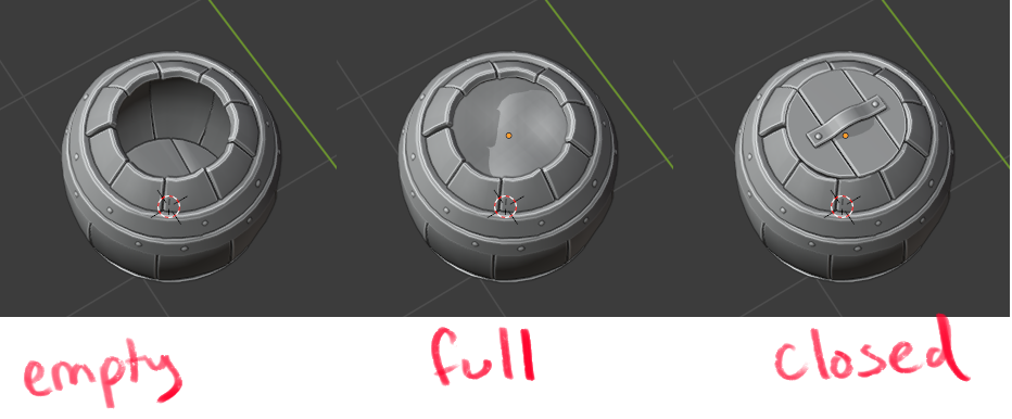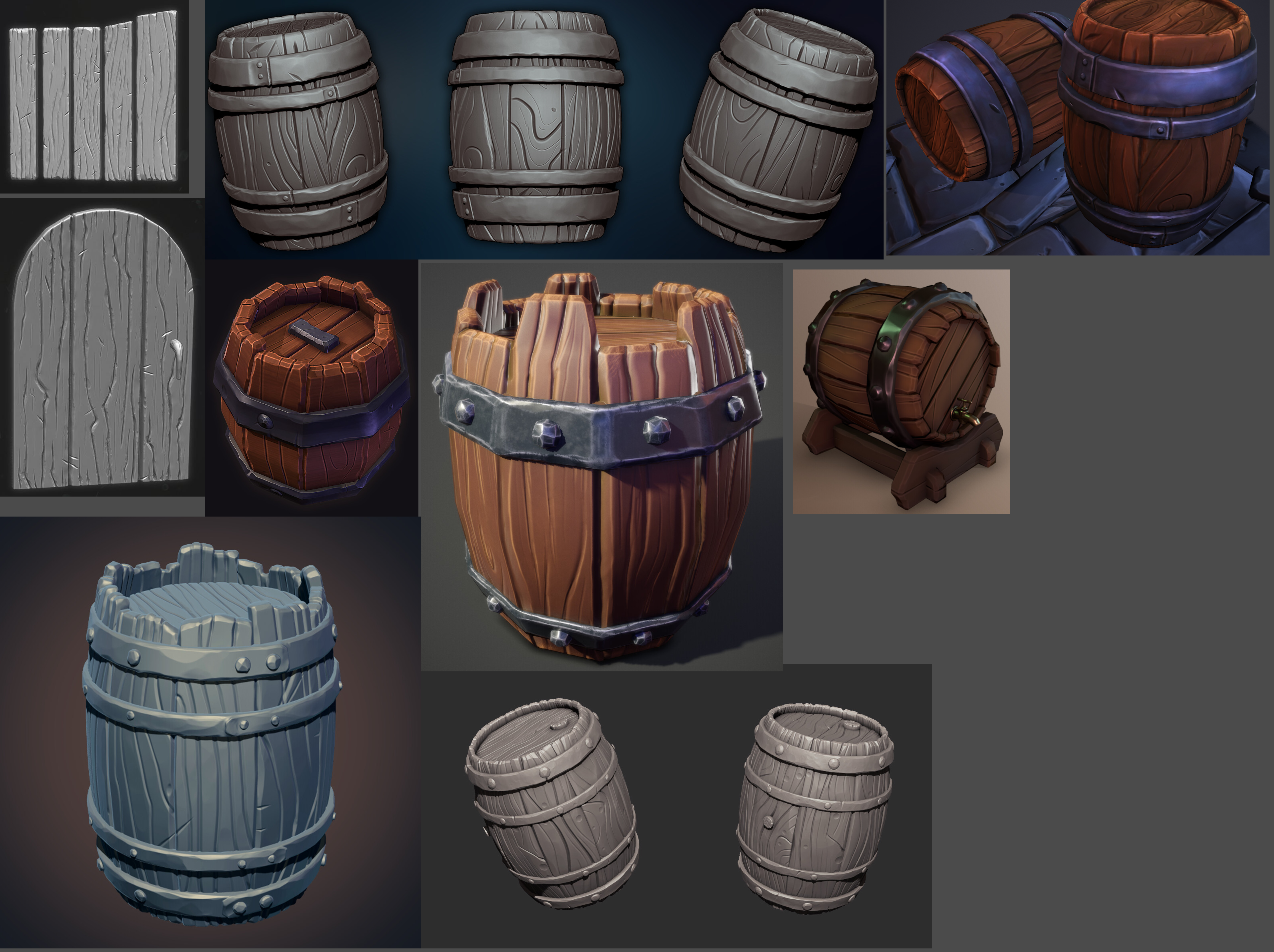 I started by collecting a bunch of reference images I like of barrels done in a style more or less compatible with our style guide.