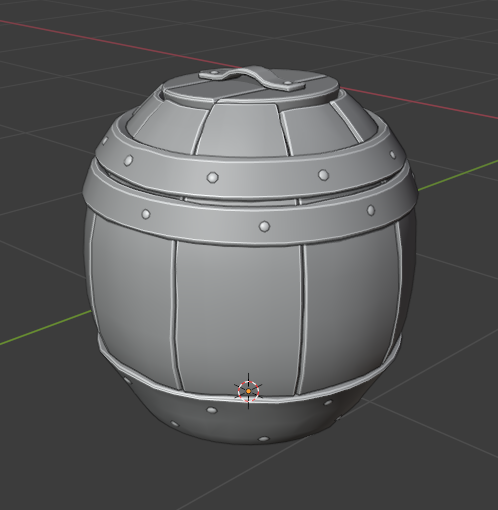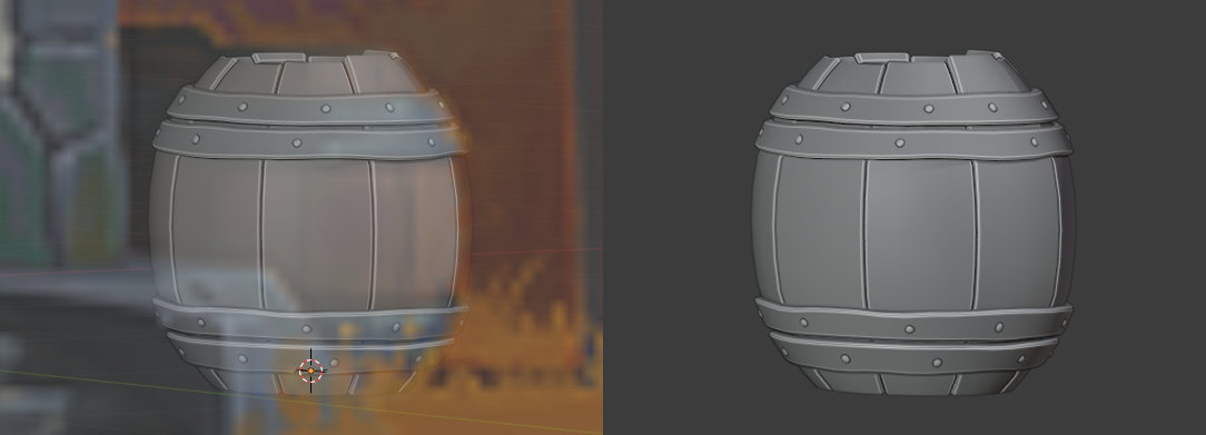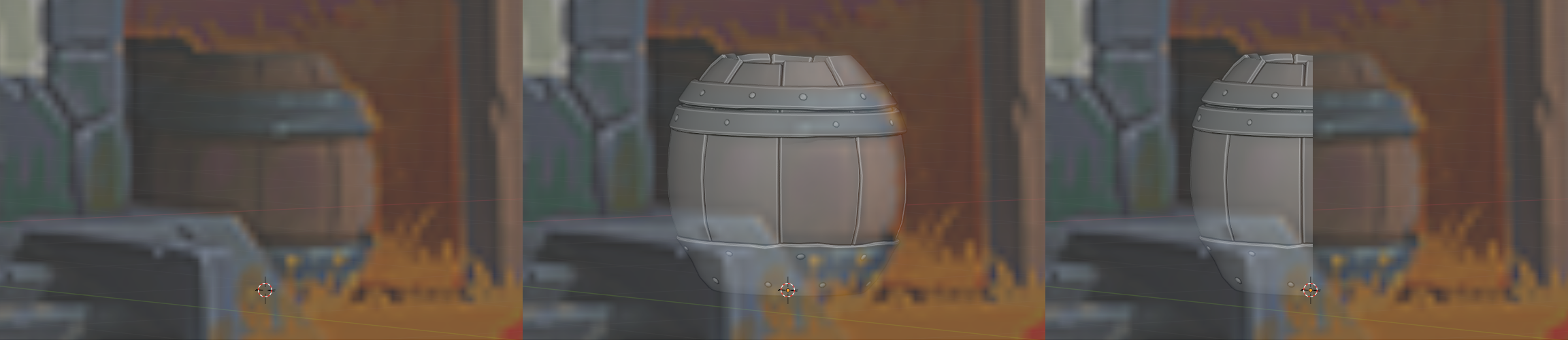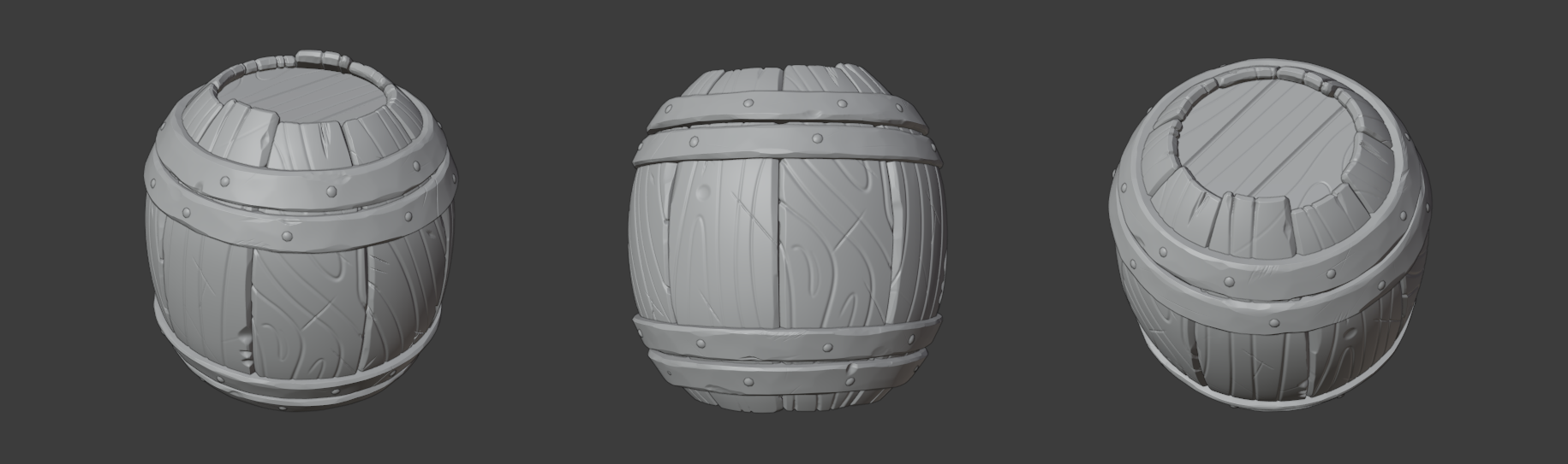 So I changed it to have a metal bottom, and messed around with the proportions a bit, and added a bit of randomness to the whole thing. Thinking about the comments above about being able to see it from all angles, I thought it'd be interesting to be able to look inside and added a spice layer. And a removeable lid for practicality's sake to keep the spices protected but also be able to access them easily. So now if the barrel gets duplicated around the environment (eg if there are more barrels round back), they can appear more varied by having some empty, or some with different colors of spices, or some with the lid on or off.