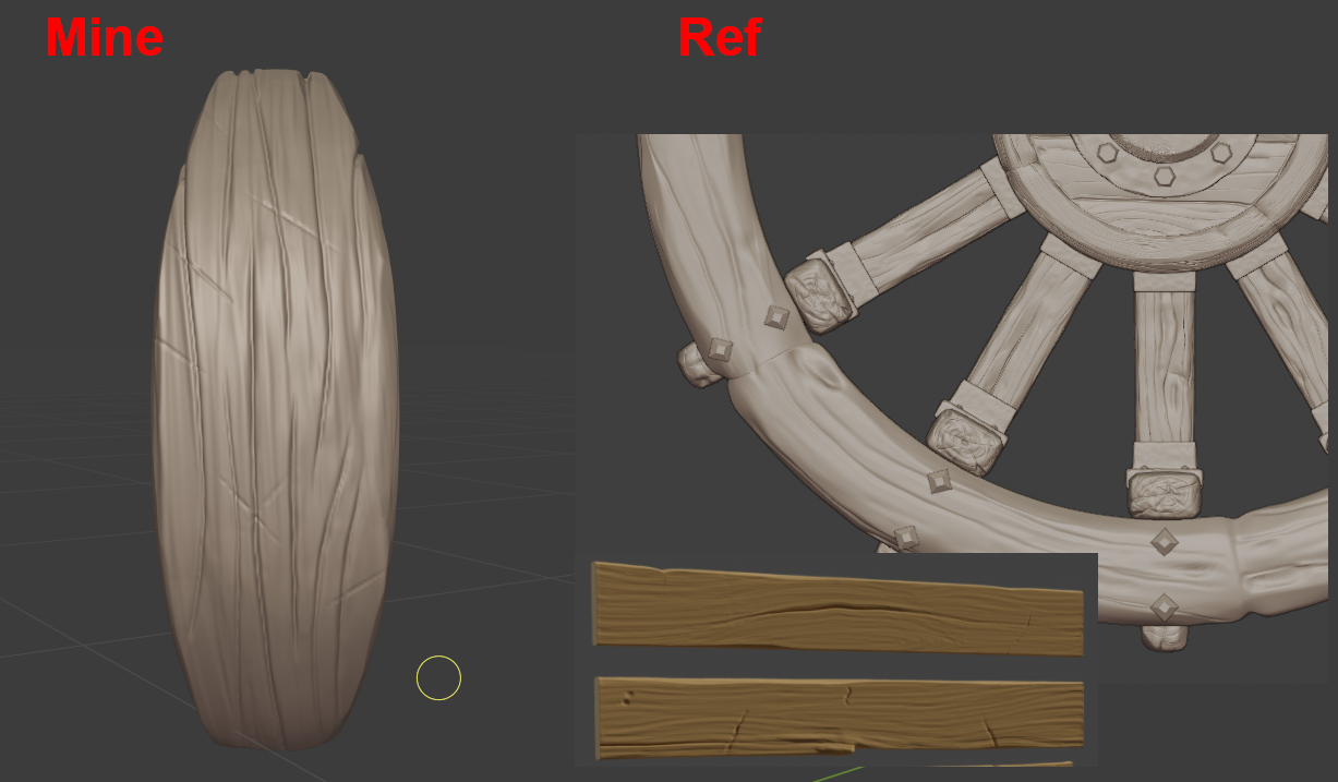 wograebn This is already looking great 👍! Maybe some of the wood pattern lines are a little bit too curvy relative to the plank edges. The curvature pattern in your reference image above (bottom left) is what I would use.