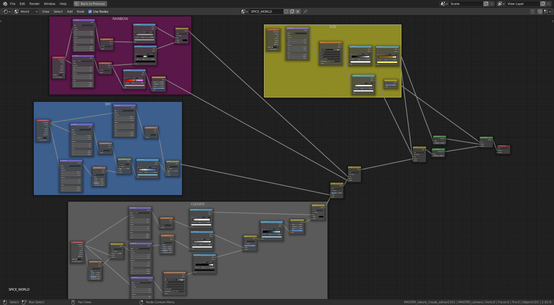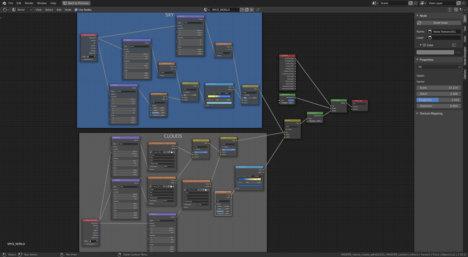 I had the alpha maps from previous experiments and added them to the spice world sky, with some adjustment in the mapping nodes for placement.