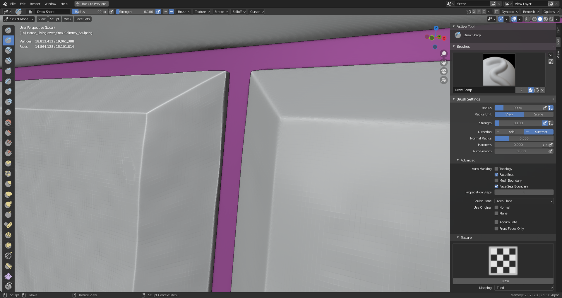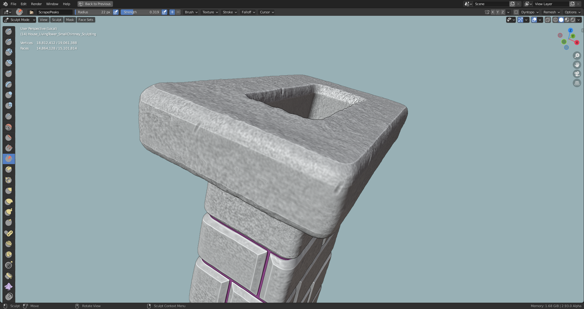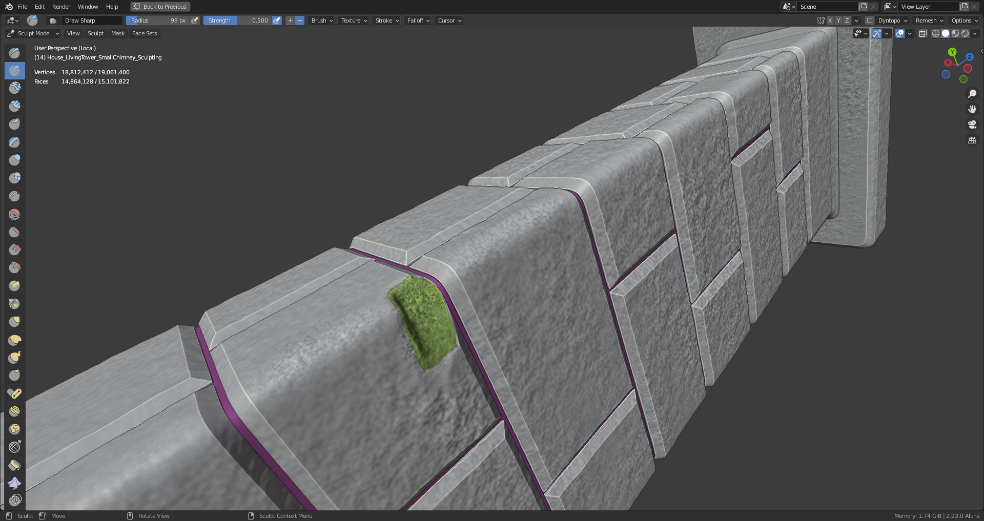 90% of this is only the Scrape brush chiseling the perfect, uniform blocks into imperfect, hand-made versions. I also used the Crease brush to vary the depth of the crevice between blocks. The goal here is "handmade" and "imperfection".