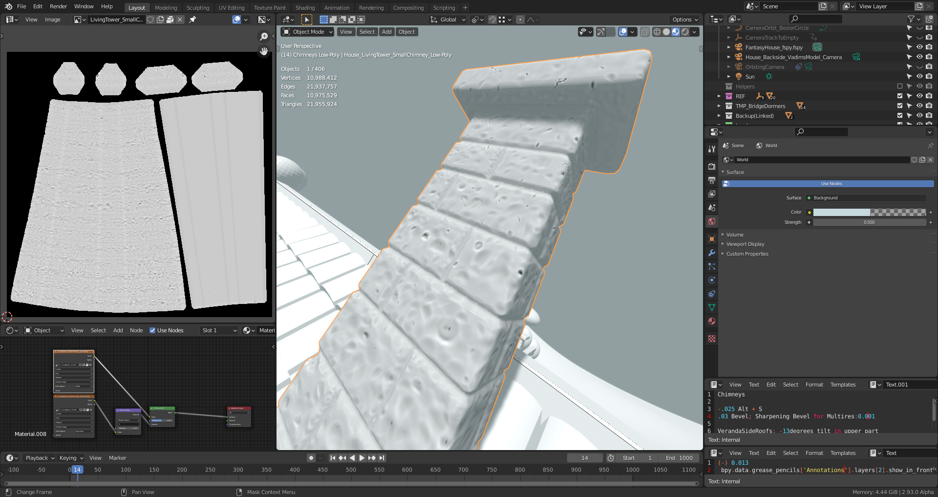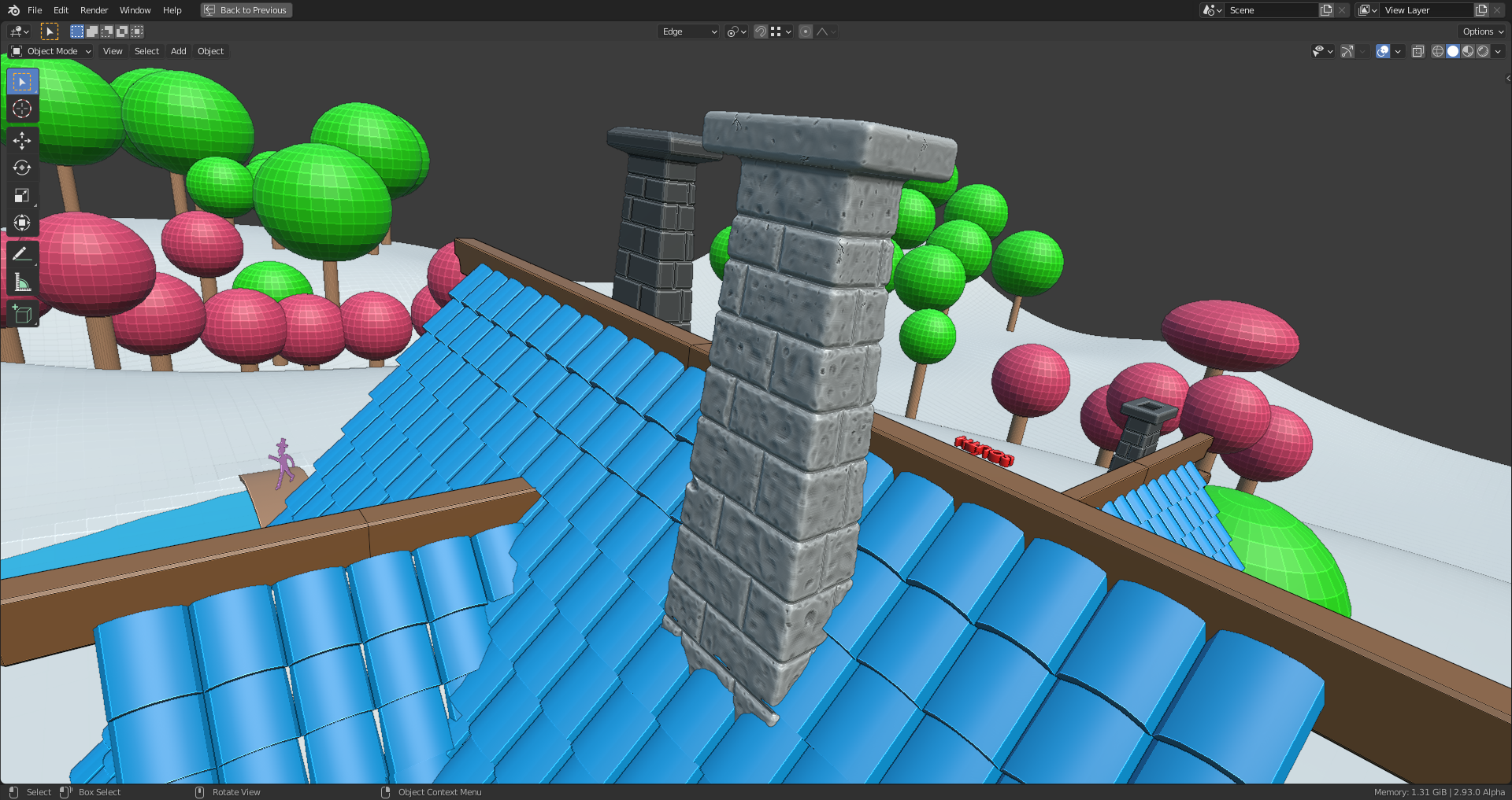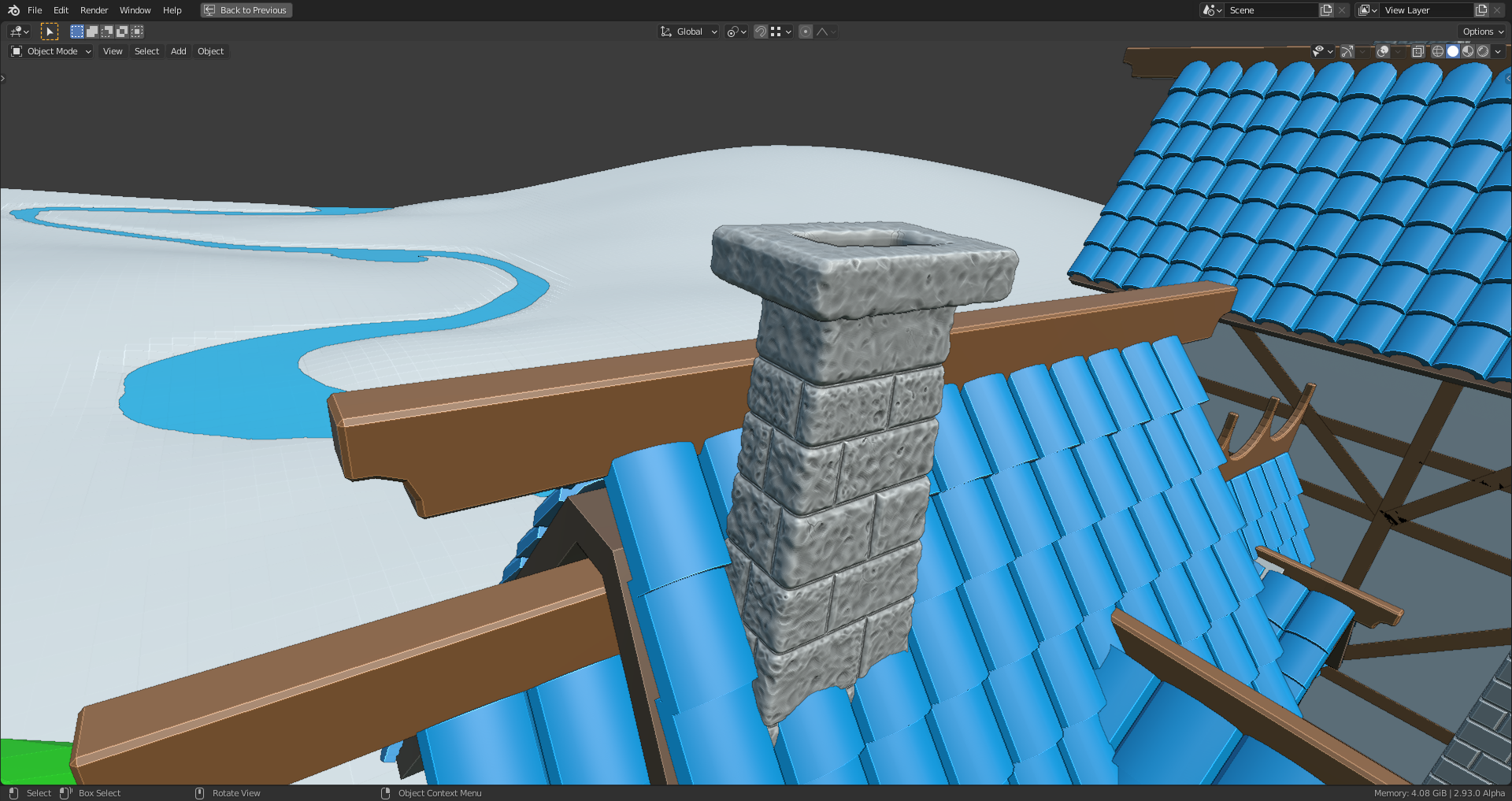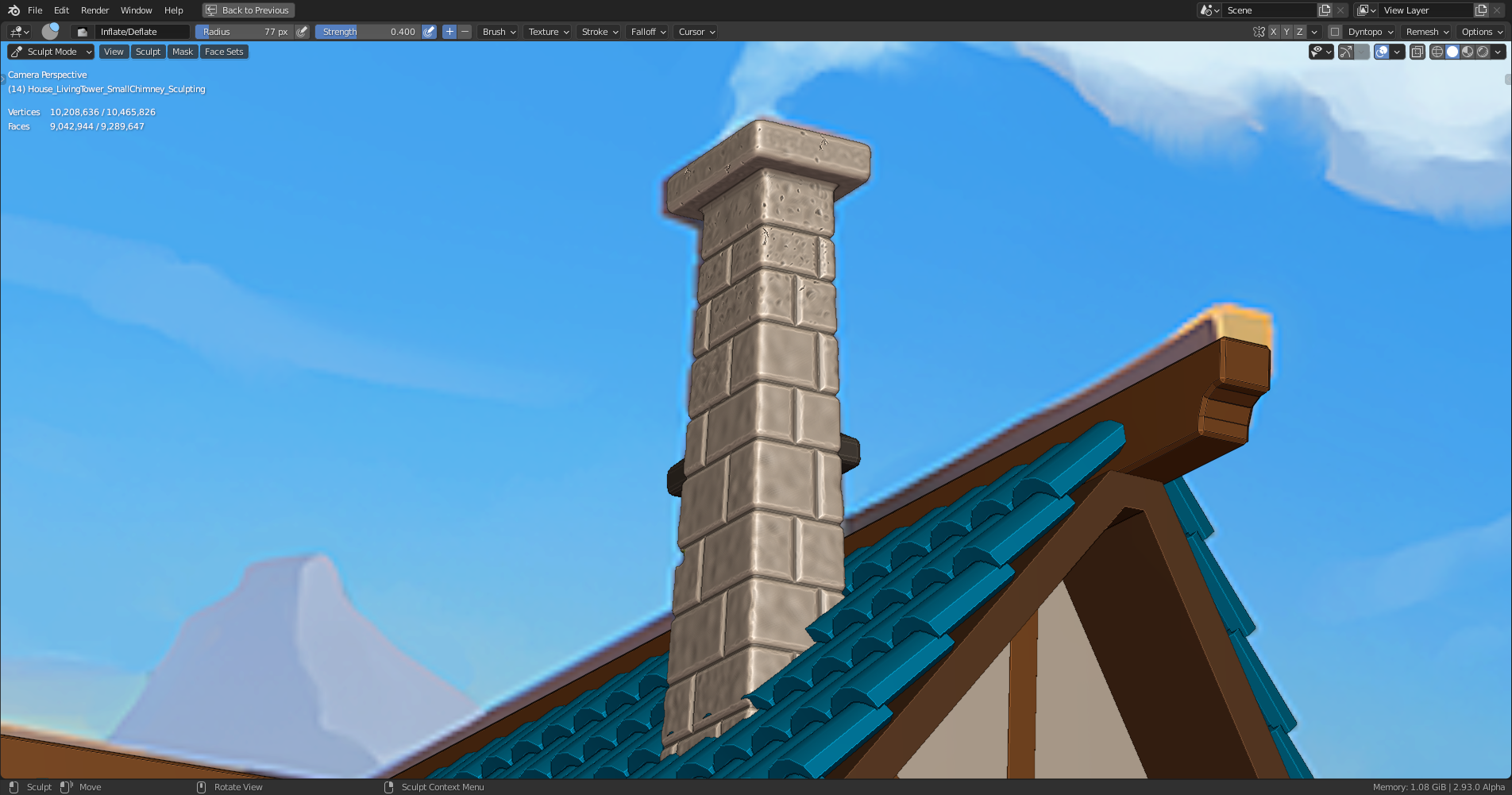 duerer Your latest chimney sculpt looks good! It looks like you're sculpting both chimneys separately. I'd recommend only doing one and duplicating to the other side. If you're worried about the chimney inside the house, I suggest to not worry about that. The more I look at the chimney placement the more I think we'll have to cheat their placement inside.