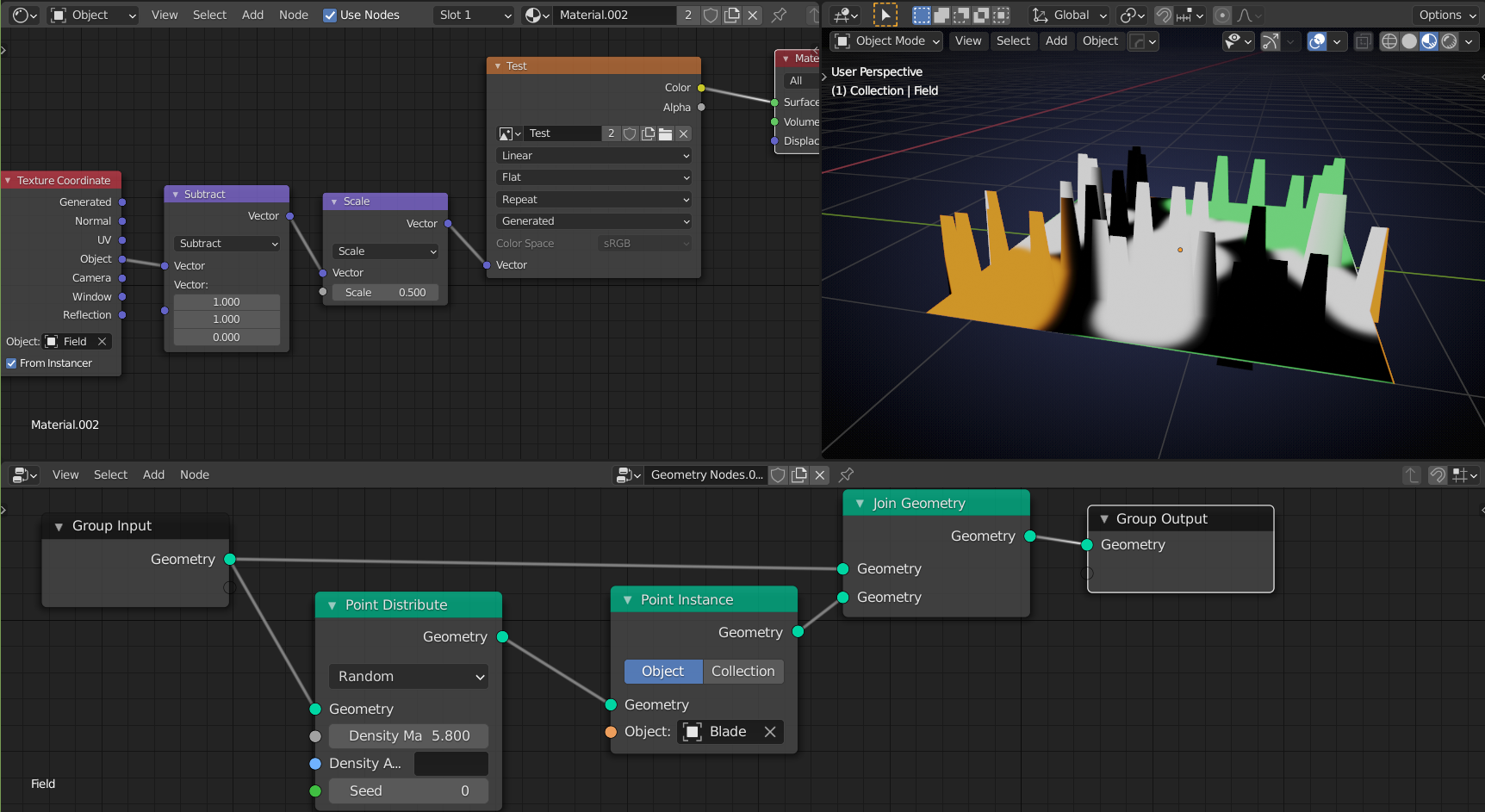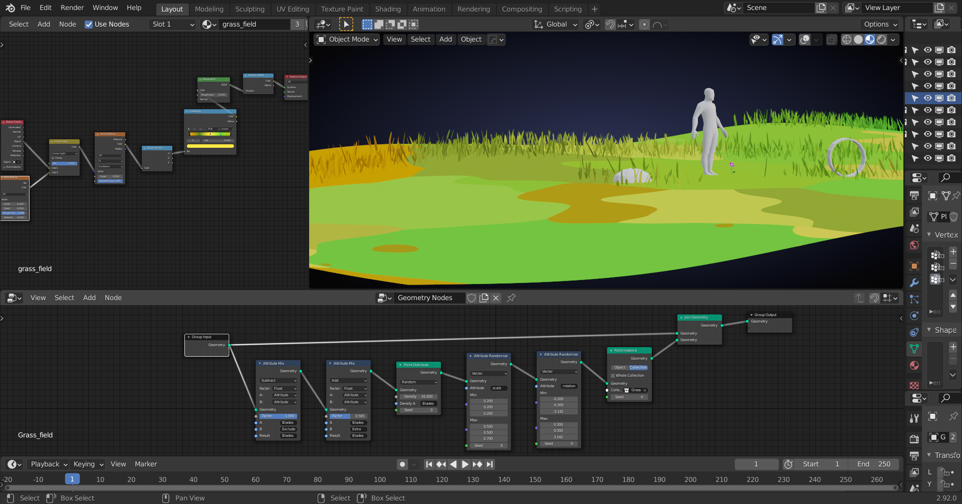 spikeyxxx @lampel If GN is faster than particles, I wonder if you could influence the scale + visibility of populated grass cards based on the distance from the camera. Like culling so the ground doesn't show hair cards when they're too far away.
