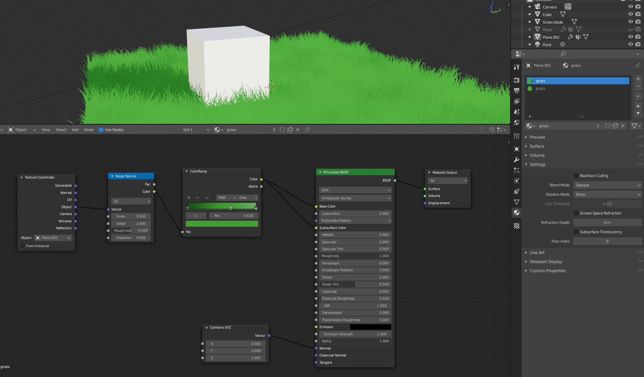 Using 'From Instancer' in the Texture Coordinates, to color the instanced grass blades the same as the underlying grass field.