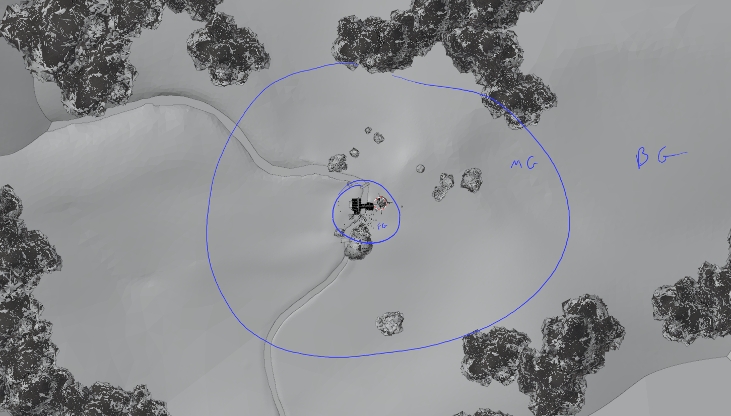 I can't find the clip with the exact boundary, but the way Kent explained it to me was that the foreground was everything directly around the house and we can assume the camera won't stray outside of that circle.