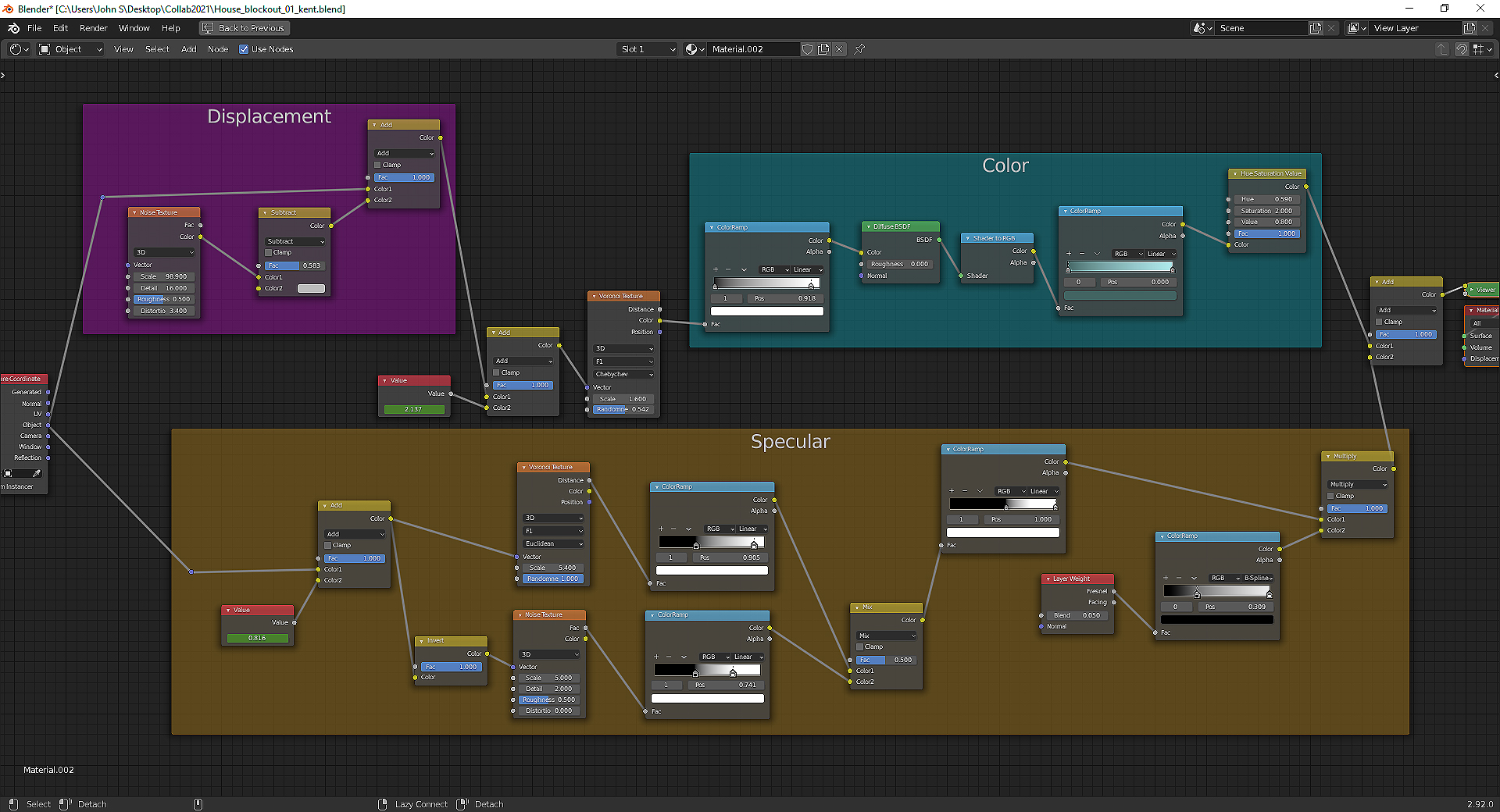 And here is the node setup if your curious. Â Spikey says the math is bad, which maybe true, but I'm putting math in the "finishing touches" category for now and just trying to find the right look. I don't know how complex the shader can be before it becomes too cumbersome for eevee, but I don't think I'm there yet. Any and all feedback is welcome!