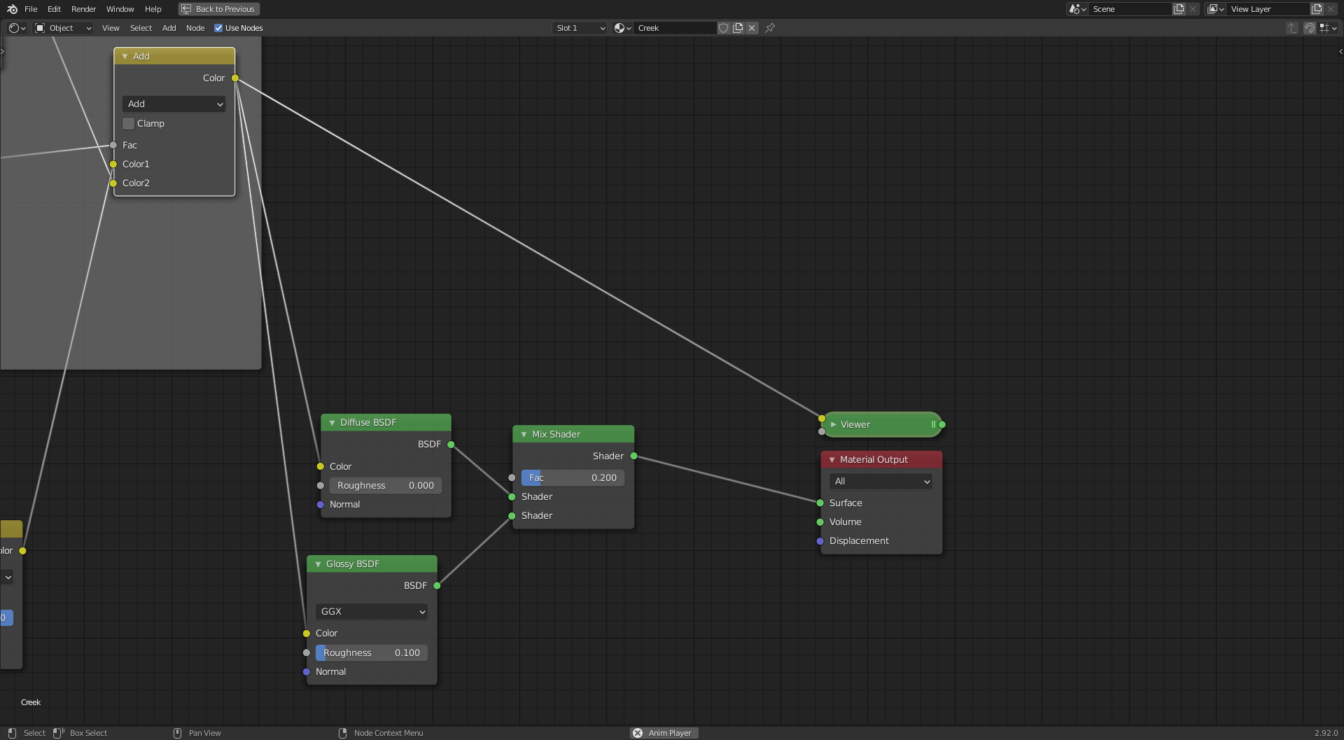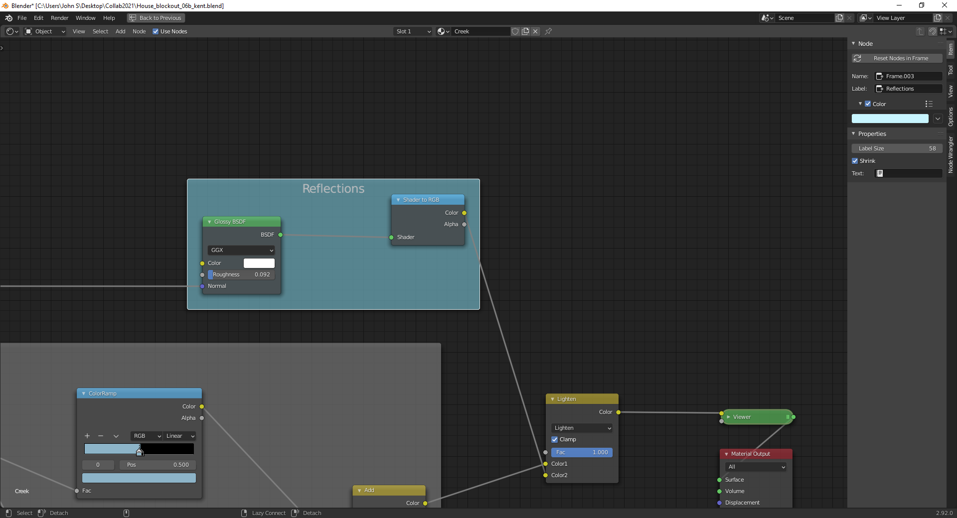 Thanks for the feedback @adrian2301 ! I am indeed trying to work out reflections this week.  This is the set up I have come up with thus far, but I haven't pushed it to the master yet cause there are kinks to work out still. I'm trying to keep everything in the viewer/emission node to keep it nice and stylized and probably won't be adding any translucency both to save computational load and to match the style in the artwork as best I can.  I'm fairly happy with how this set up catches the reflections in the creek, though it creates kind of an ugly voronoi glare at certain angles so I will have to  fix that.  The other thing is that Eevee reflections are kind of broken in and of themselves so it will be a question of tradeoffs I think and determining whether it's worth it or not, but I want them in there if possible since the concept definitely has them.