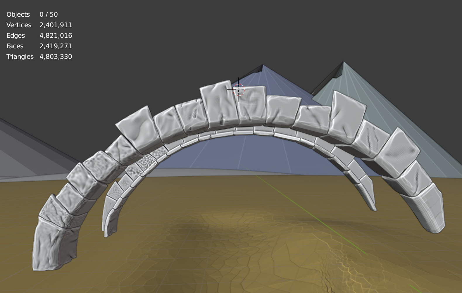 I also noticed your arch is mirrored at the base level. Which means your sculpture is using twice the amount of geo that's needed. I recommend deleting the back half of rocks and use a mirror modifier to get those more efficiently.