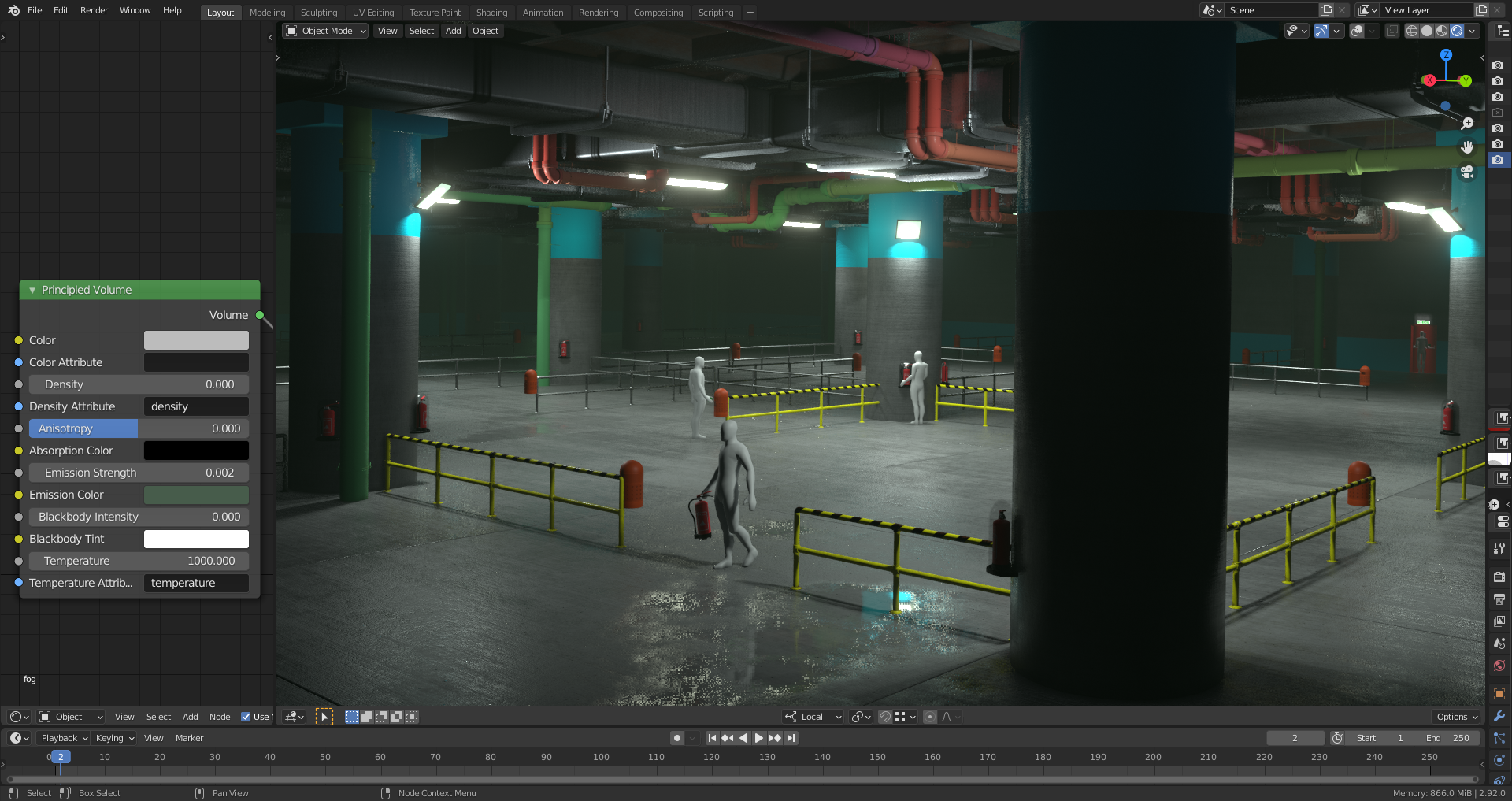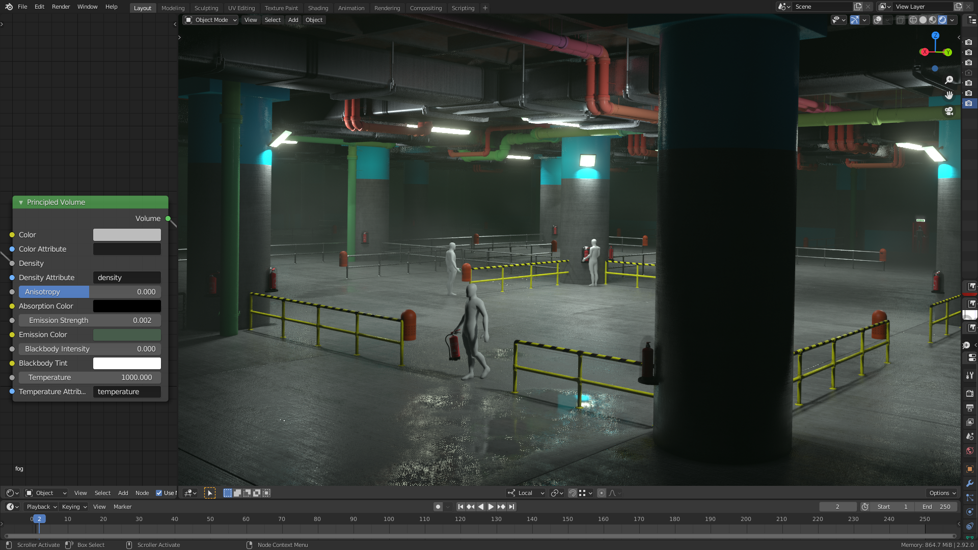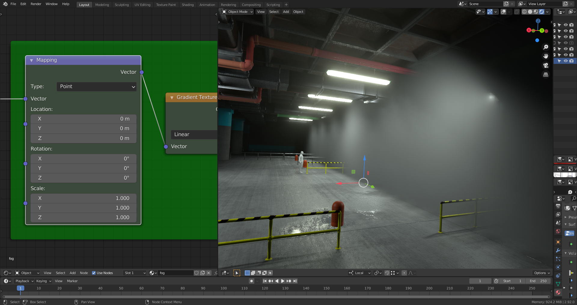 The "Cordinate System" gizmo at the bottom center of the fog wall above shows the orientation of the "Local Coordinate System" of the "Fog Object". The fog shall be transformed so that there's a fog layer floating directly under the garage's ceiling while the space below down to the floor is clear: