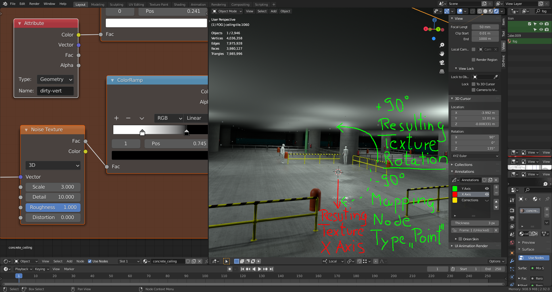 This means that the fog must be rotated + 90 degrees around the "Fog Object's Local Y Axis" (counterclockwise with the "Local Y Axis" pointing at us). Since the "Mapping Node" is set to type "Point" we have to enter the opposite direction of - 90 degrees. The "Fog Object's Local Coordinate System" has to be rotated mentally in the same direction as the texture so that the "Local X Axis" is now pointing downwards relative to the camera's orientation in the screenshots above. For the fog layer to be lifted towards "Negative X" of the new "Local X Axis" we have to change the "Local X Axis" value into the opposite direction of "Positive X".