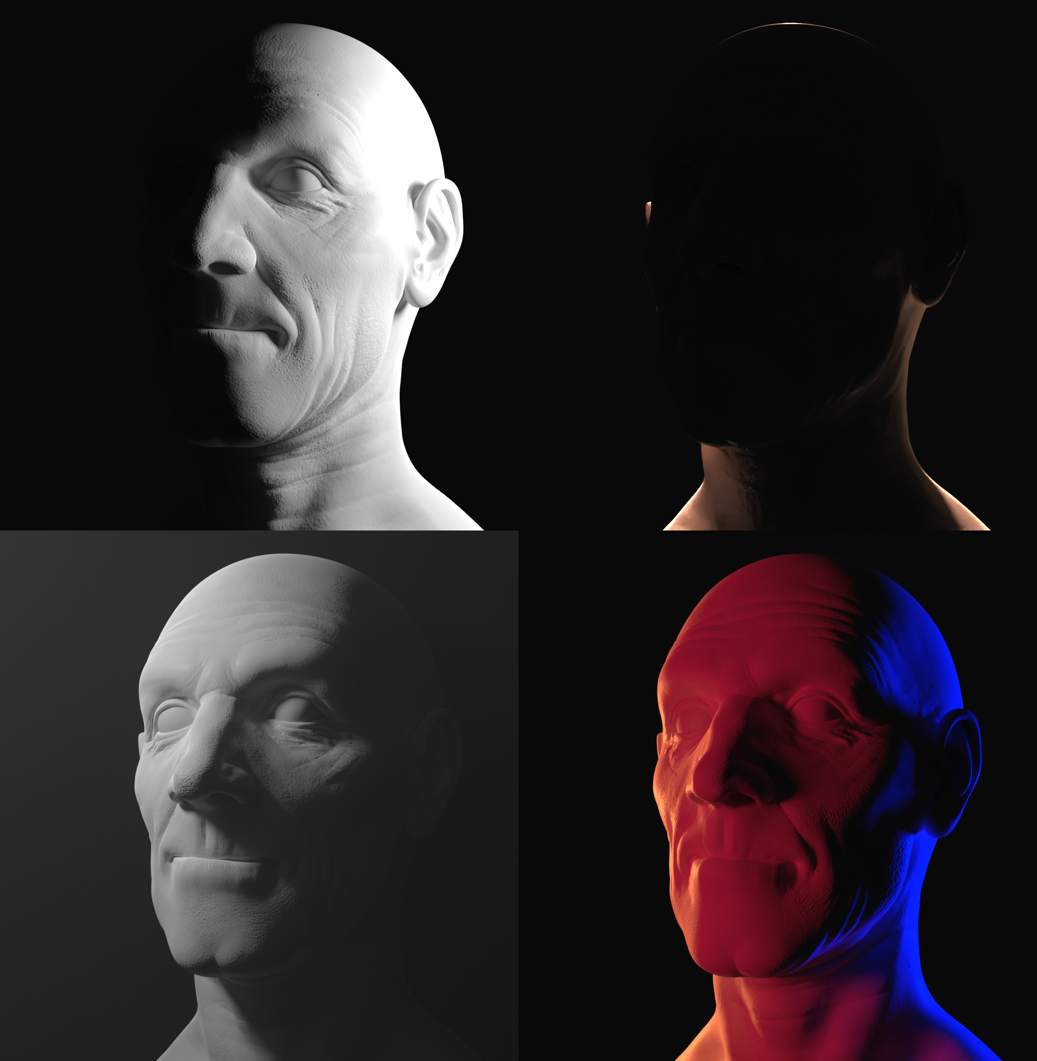 Bottom Left - Not too bad - maybe add another light off screen right and behind with a low strength, just enough to distinguish the head from the background.