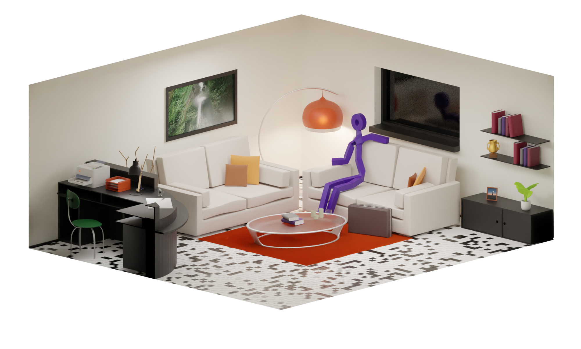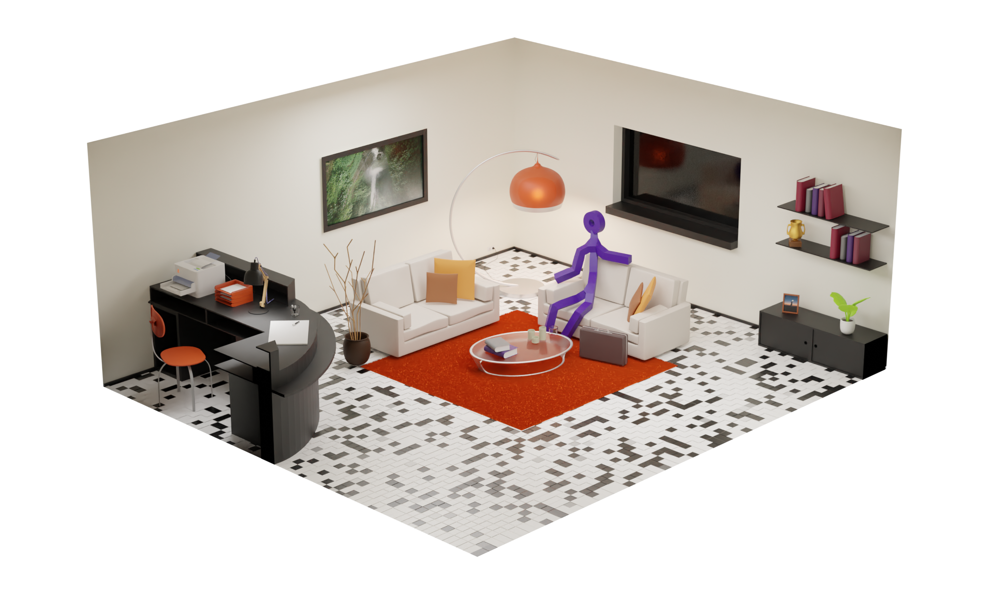 I'm struggling with the required level of detail of such a low poly render: When I see other people's work all elements look very identifiable. Whereas I feel the added detail (printer and desk lamp ) seem to be distracting and making it harder to see. Should I take smaller portions of the room and increase the relative size of everything? I'm not sure. I'll keep on testing though.