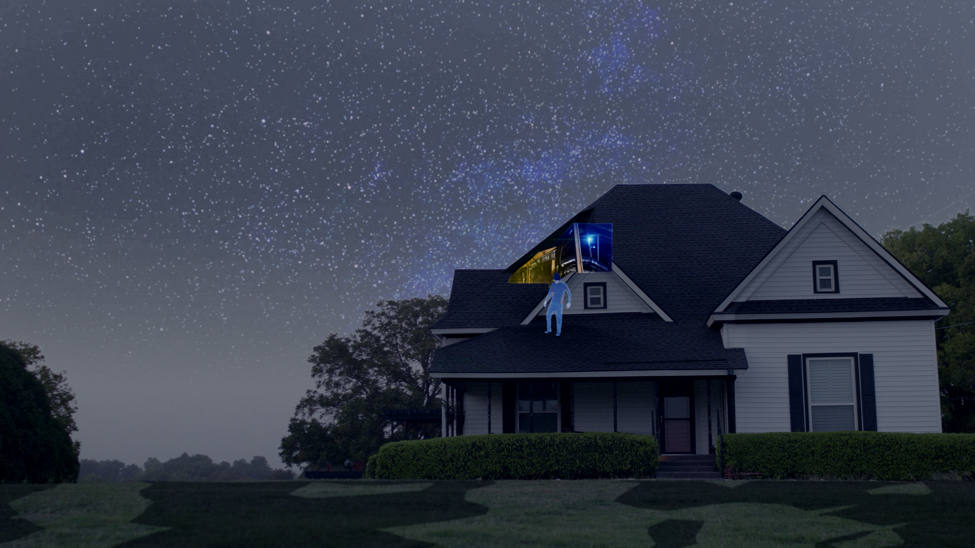 This is an Render of my first frame. I assume that I've followed all the steps of the compositor correctly but my IMG for the interior attic and human are not behind the house. what would cause this and how can i change it to be seen behind the roof inside the attic.