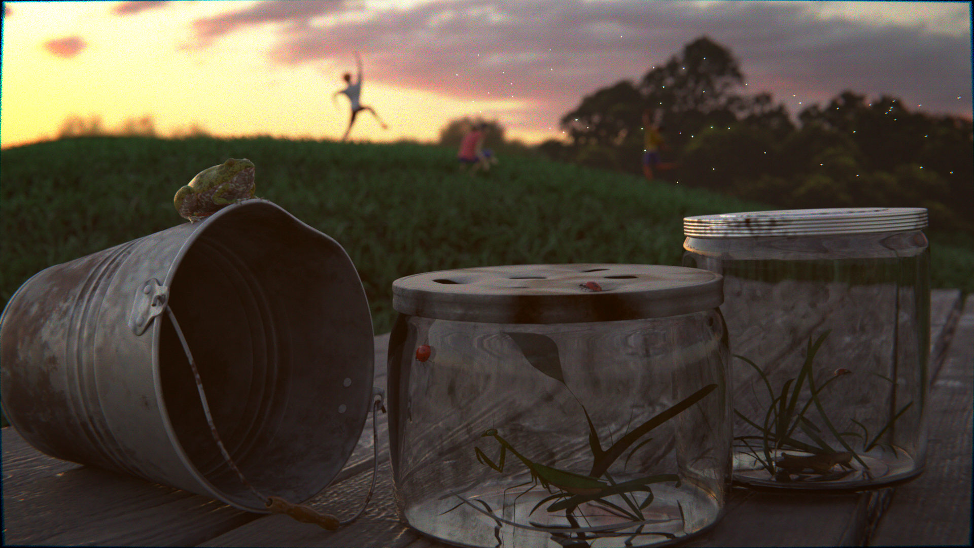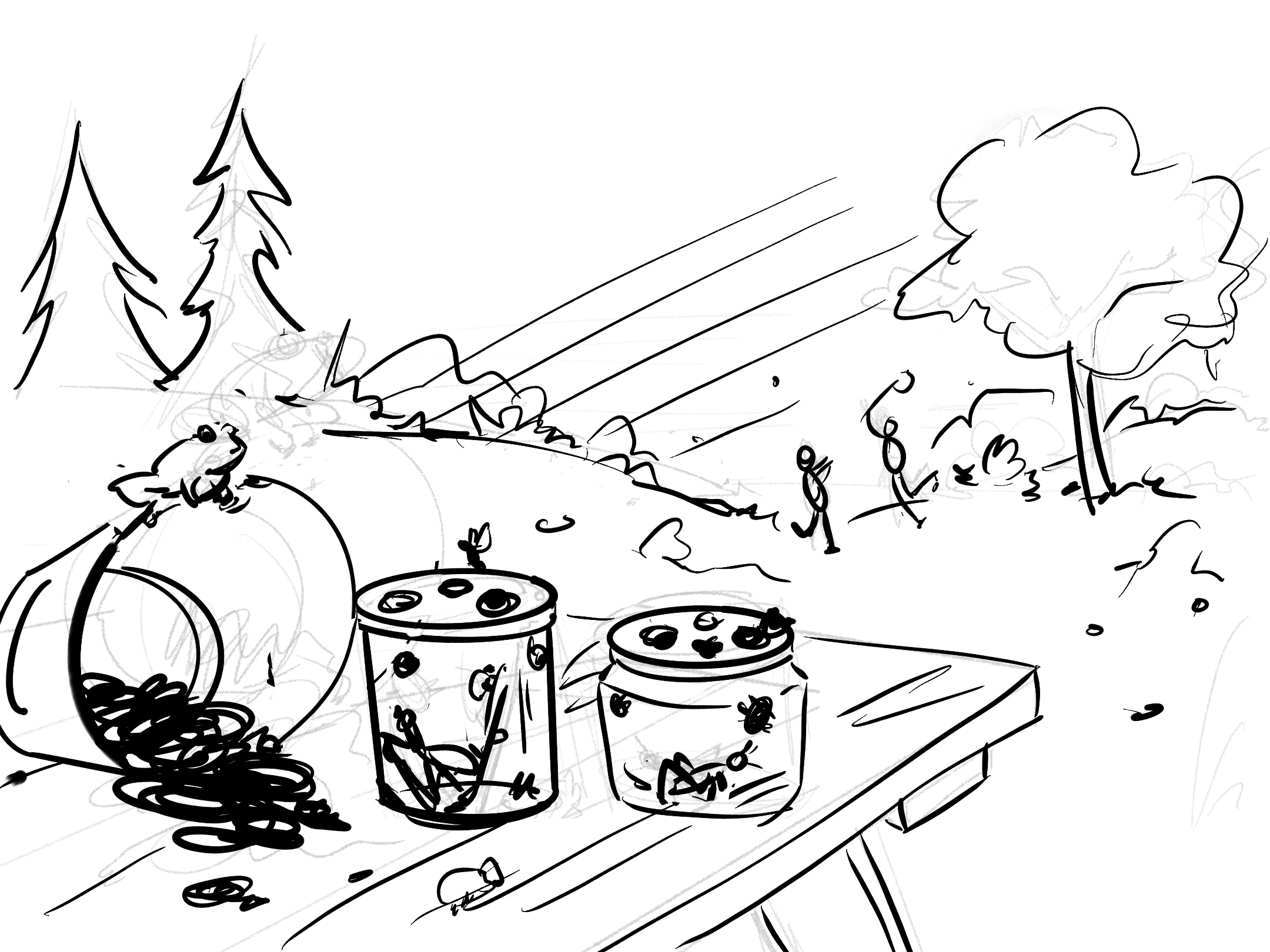 I'm imagining a backyard at dusk, just when the fireflies are beginning to emerge, and 2-3 kids have run off to the background to catch them. The main focus of the scene, though, is the foreground: a picnic table top strewn with glass jars and such containing various bugs and insects that the kids had collected earlier.