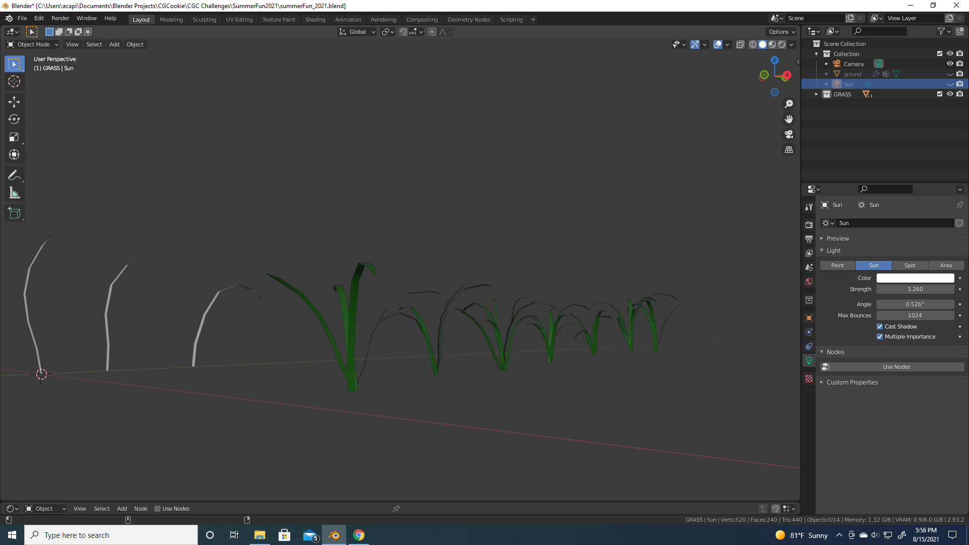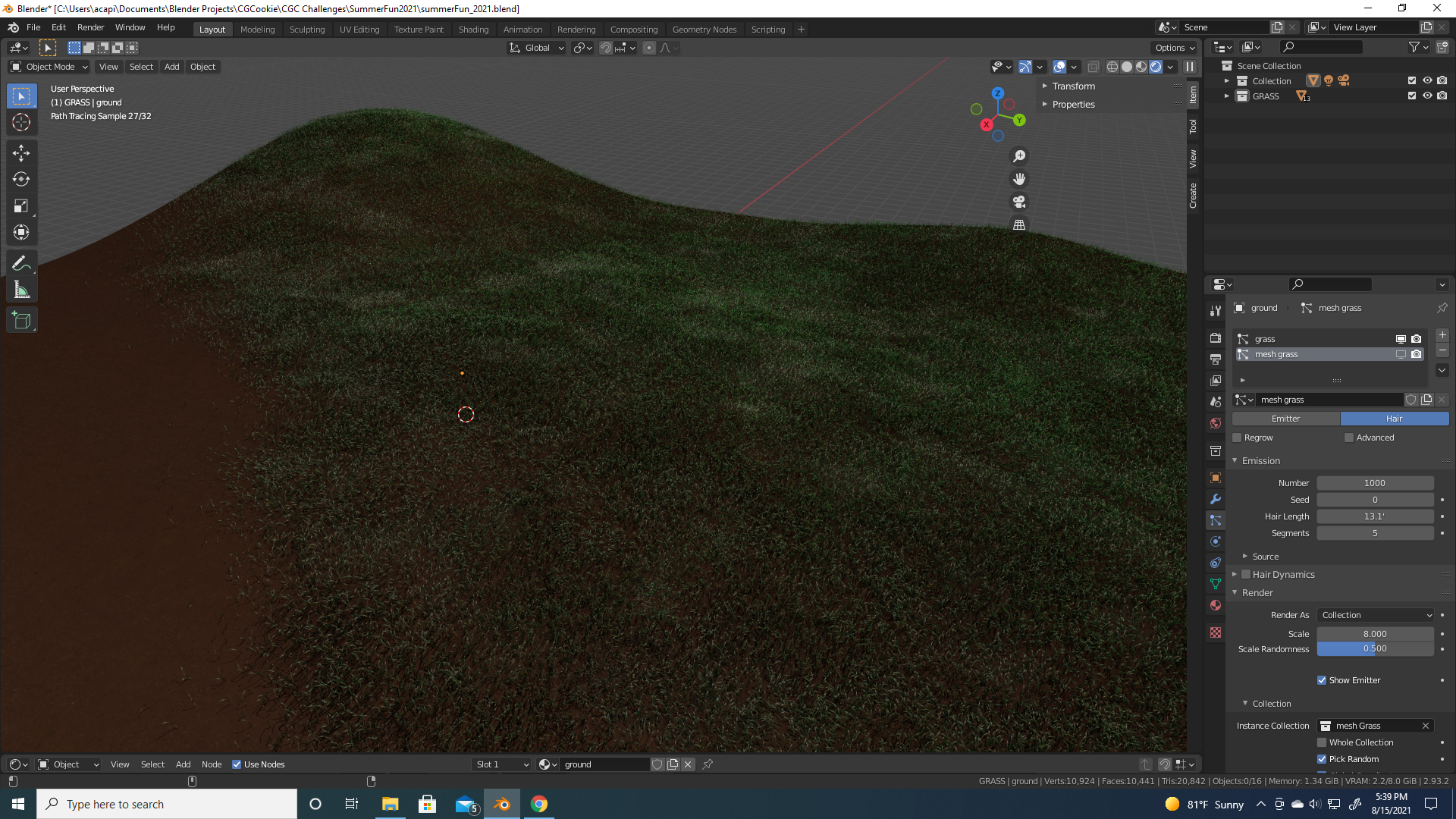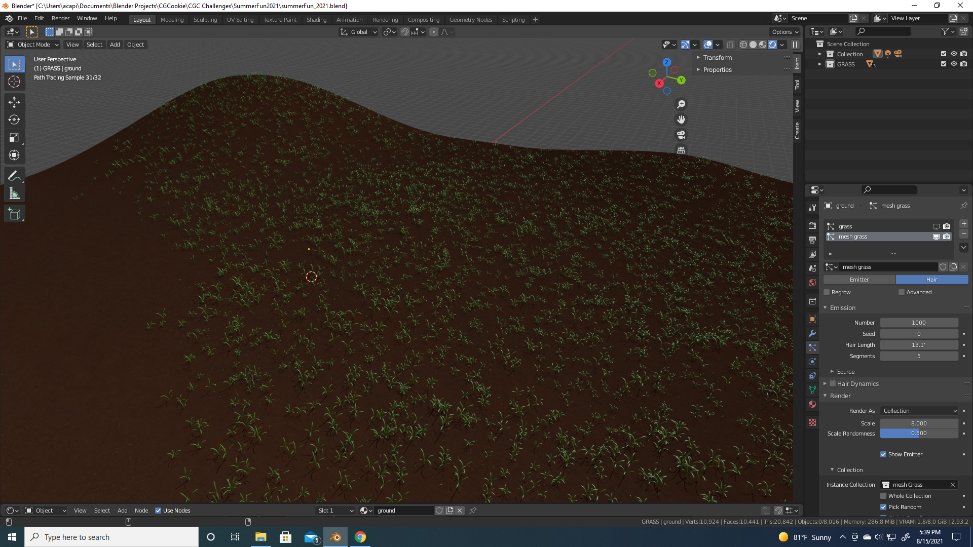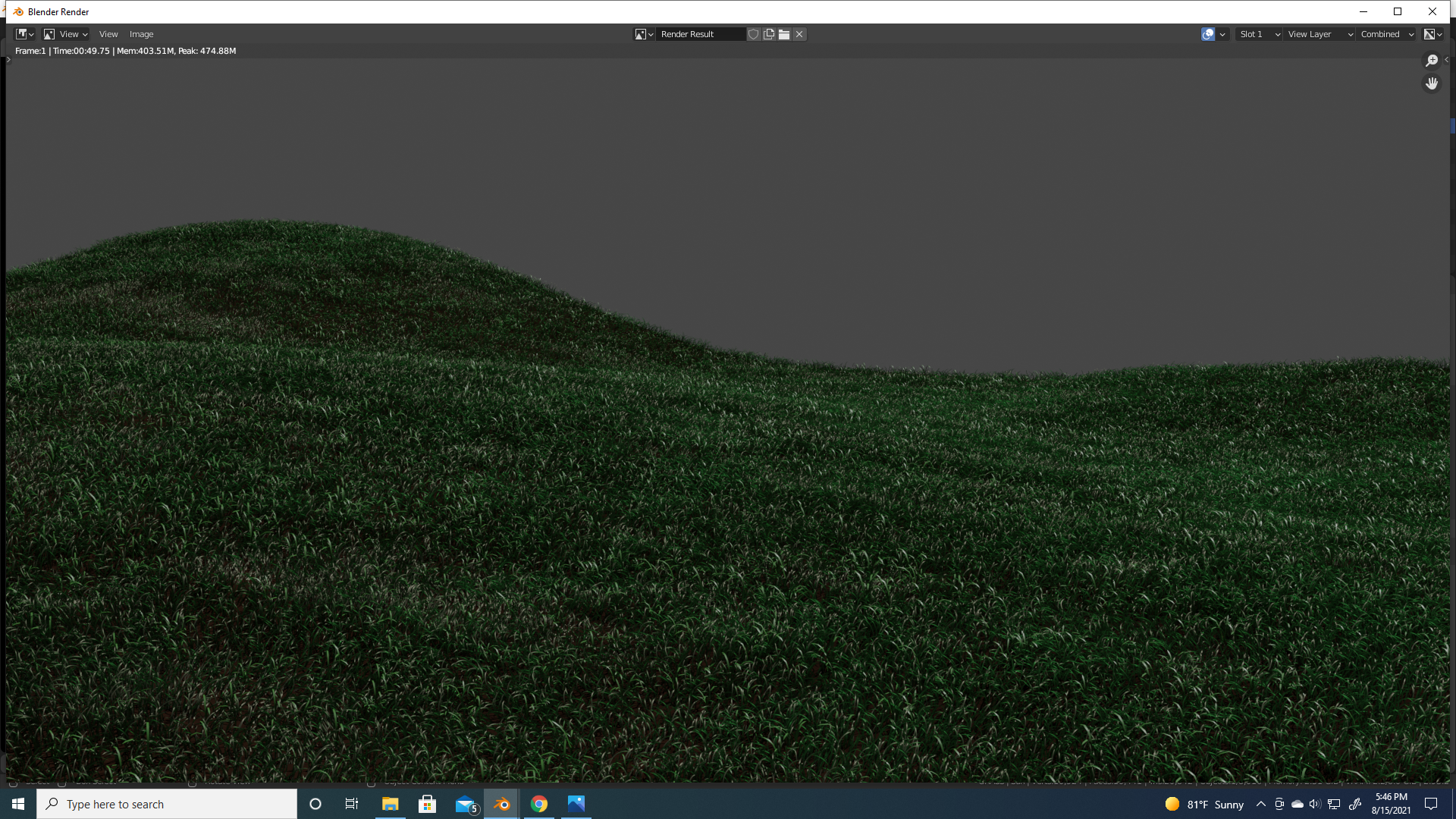 The procedural portion of the grass particle system, and a sample render of the combined systems: