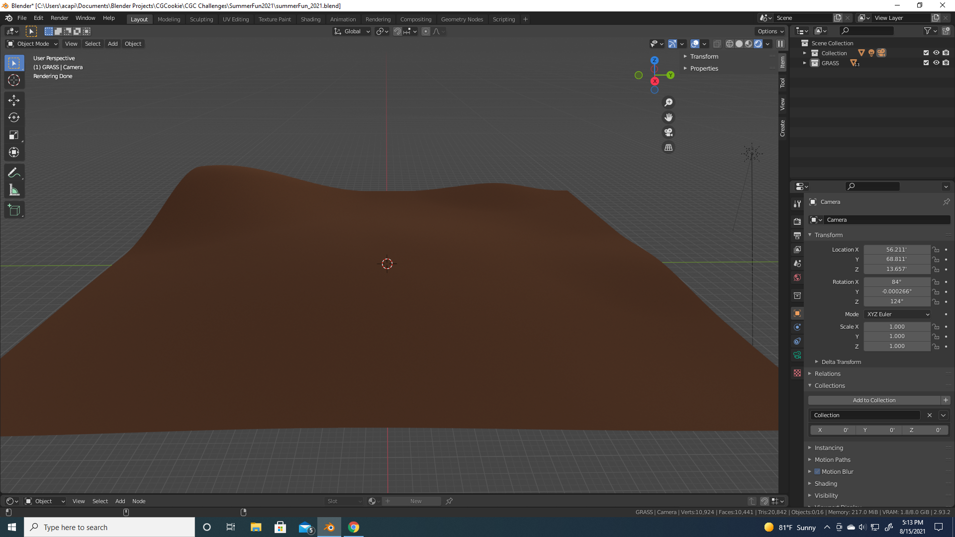 Starting with the environment. Just a simple ground plane that I subdivided and then proportional edited to get some good hilly parts where I wanted them: