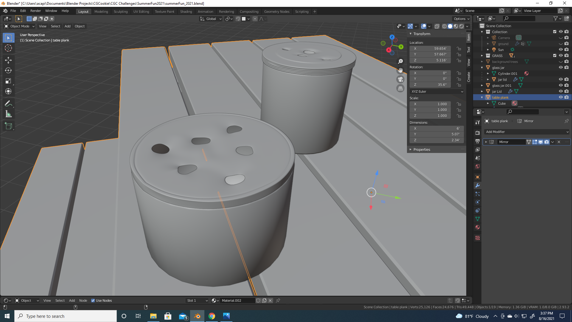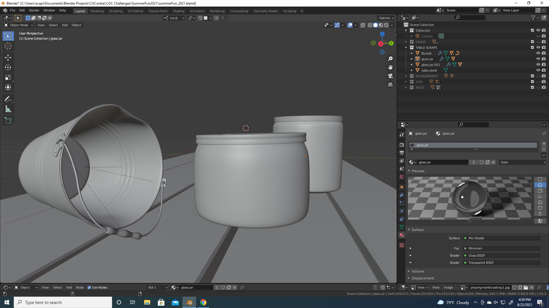 I made the pail with a cylinder and a Bézier curve and gave it a few dents to give it some character.  I also tweaked the jars to give them more interesting shape and diversity.