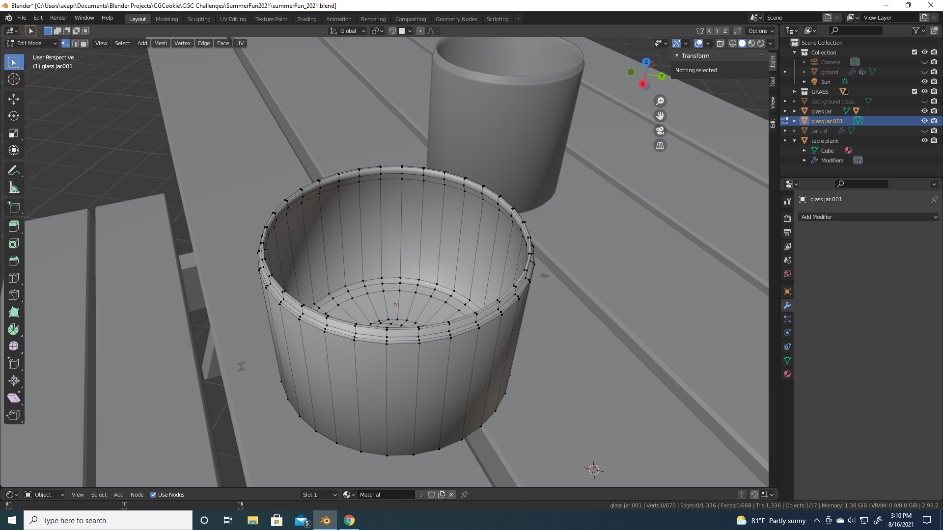 Working on what will be some glass jars. Fairly simple, just cylinders and some extrusion and beveling here there: