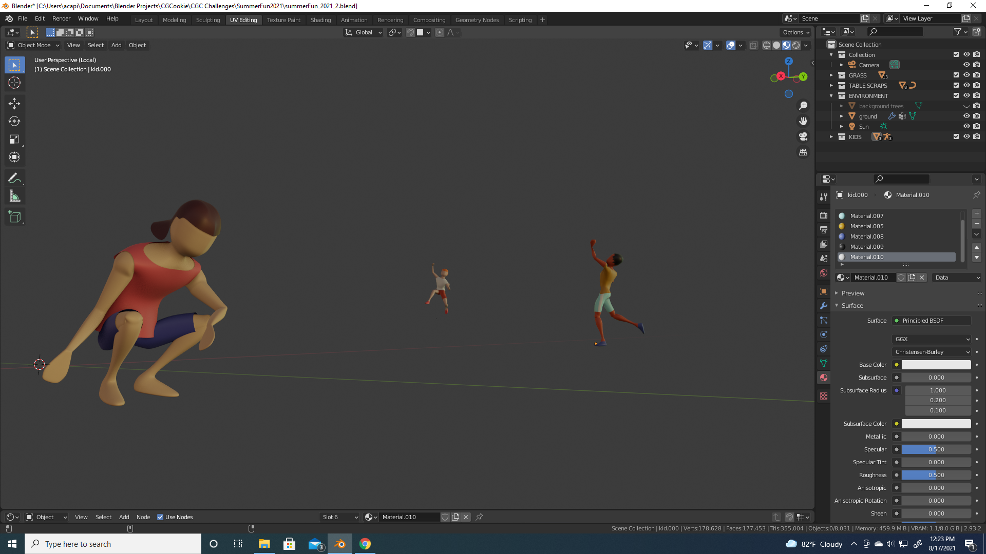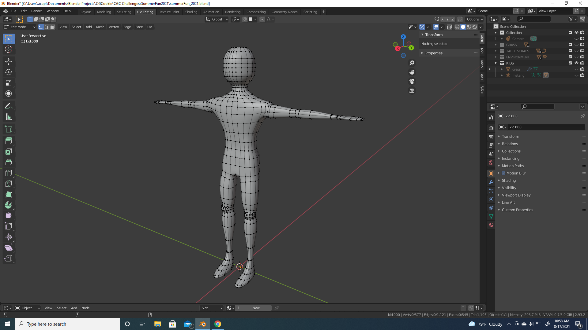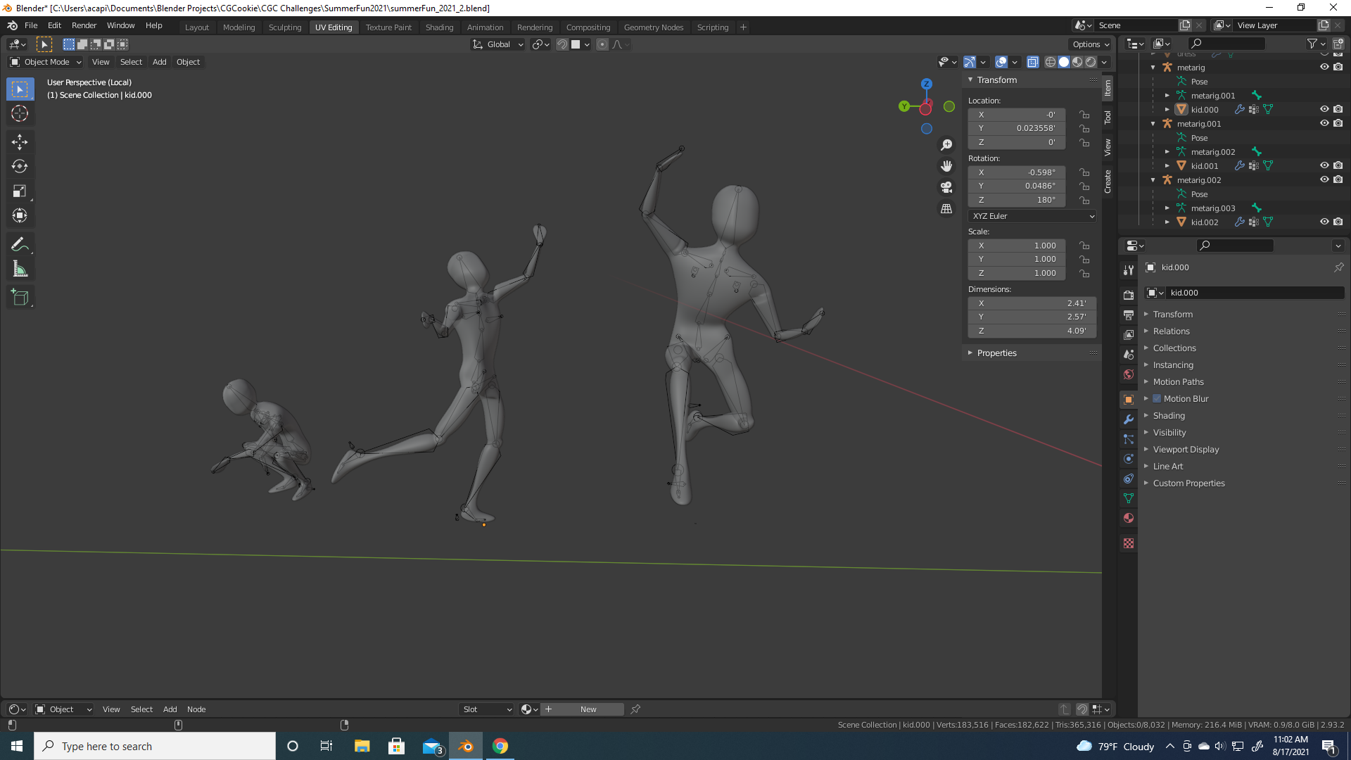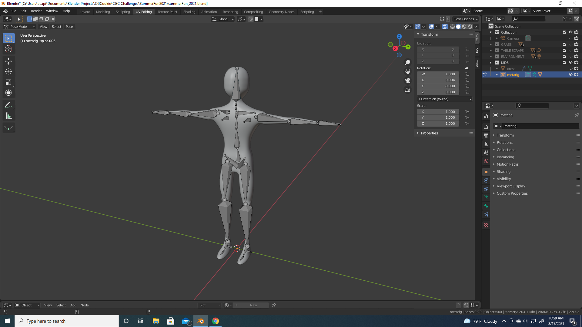 The kids in my scene will be in the background, and obscured a bit with some DoF, so I'm not super worried about their detail. I made this basic character model which I then put onto a simple armature: