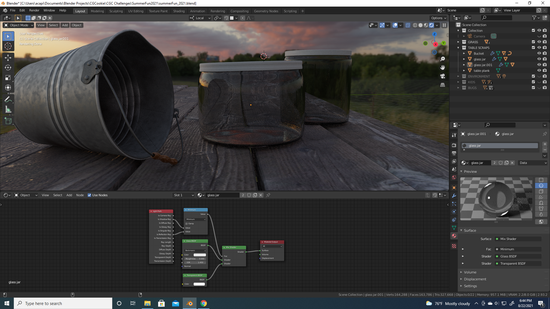 Glass shader for the jars. I used the galvanized steel material from @theluthier 's "Realistic Industrial Environments" course for the pail. I'll finish it all off with some dirt and  grime later: