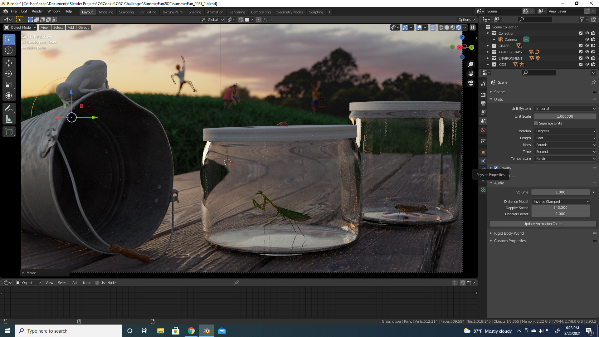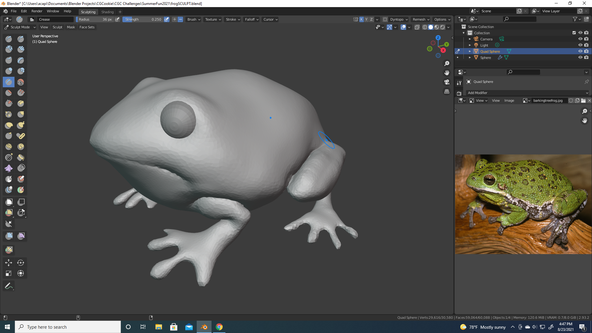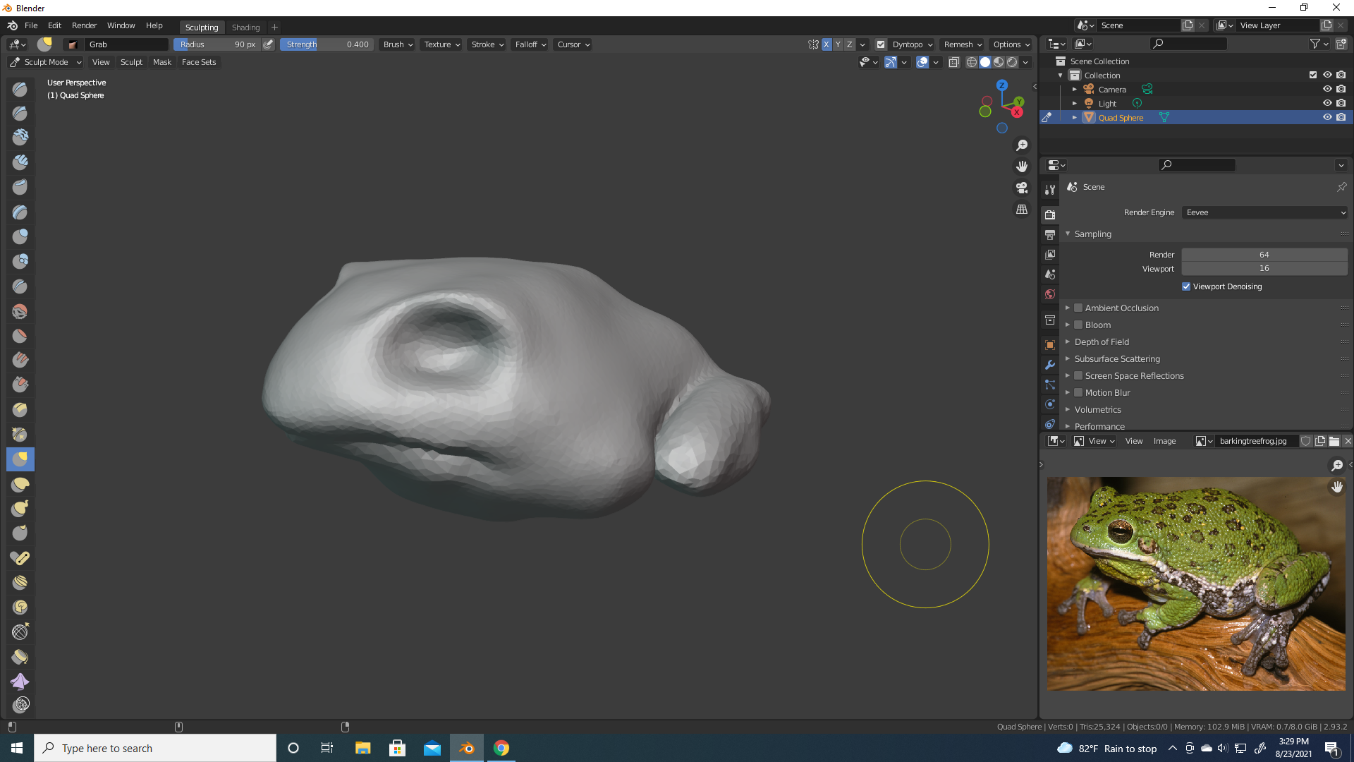 Well, it's as done as it can be as it's almost deadline! There's so much that I didn't have time for that this was a great exercise in time management.  This is my first attempt at creating living creatures in a semi-realistic model, but they were worth the knowledge gained. The frog was probably a bit ambitious, but it was fun figuring it out. Yes, he knows he only has 3 toes, and he's a little self-conscious about it so I wouldn't bring it up. 😉