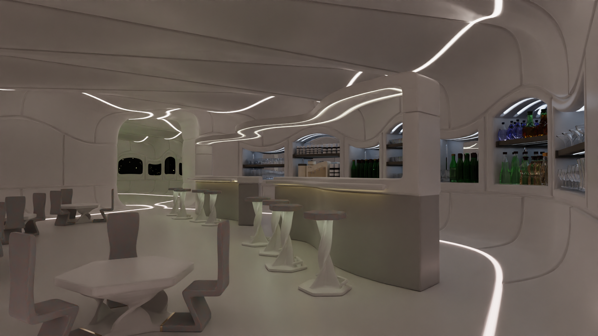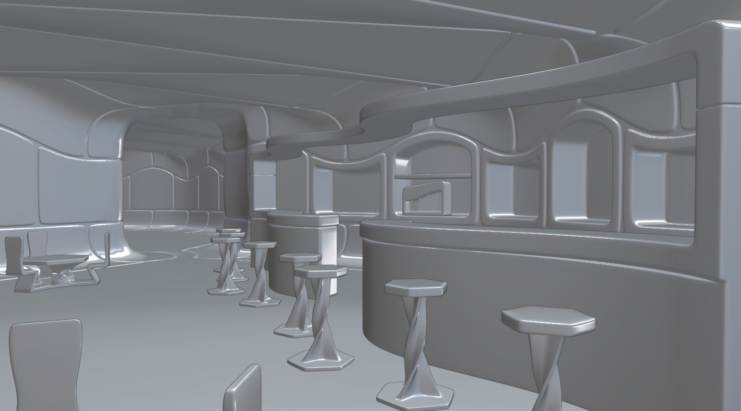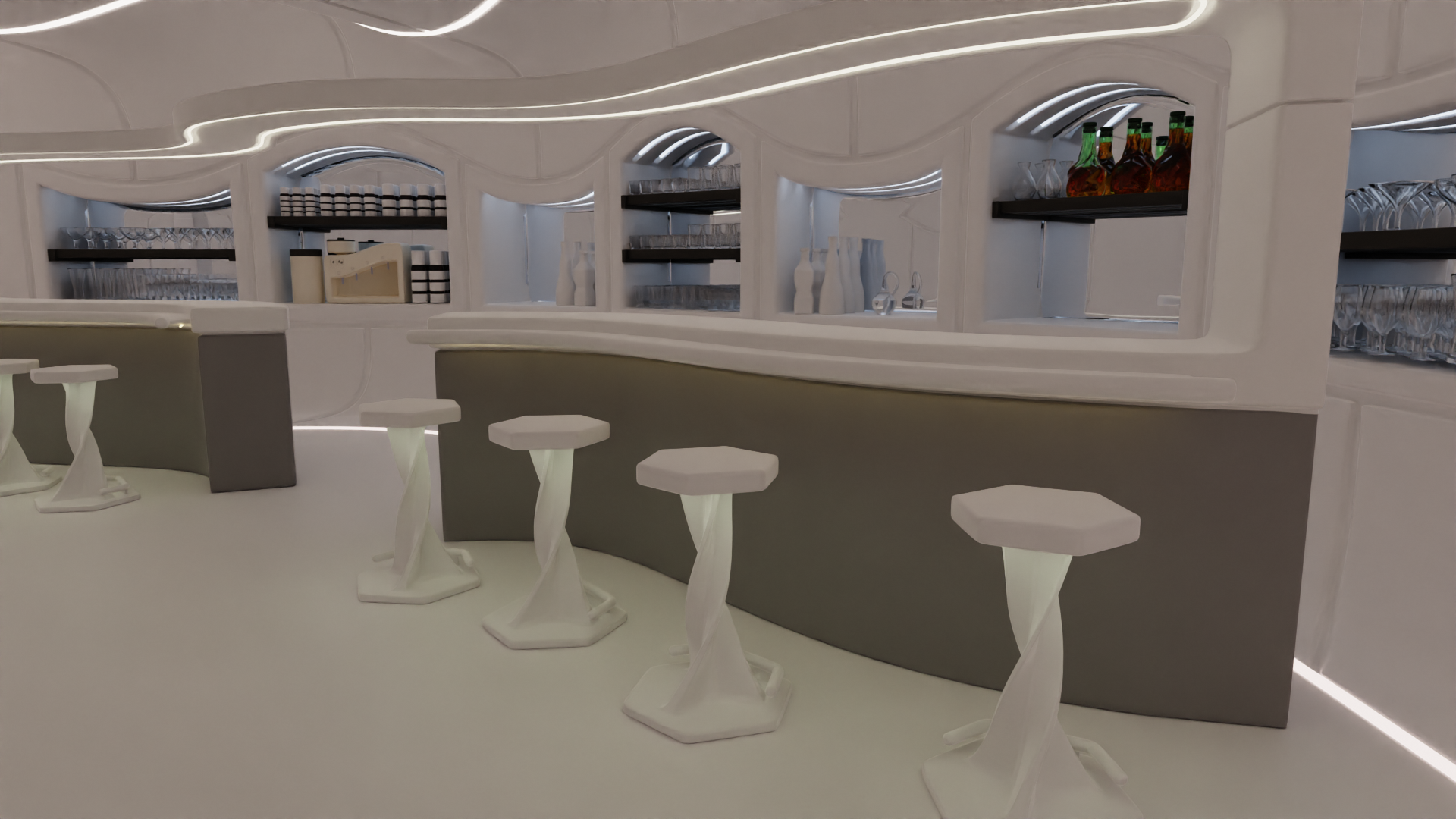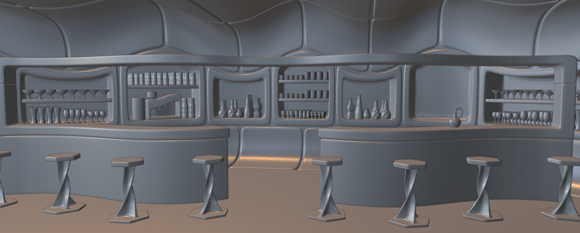 This is looking really great, Spikey! Iโm loving a lot of your design choices. The barstools, tho, look a little too far away from the bar for drunk patrons to comfortably lean over, so Iโd add a little overhang on the barย to accommodate them.