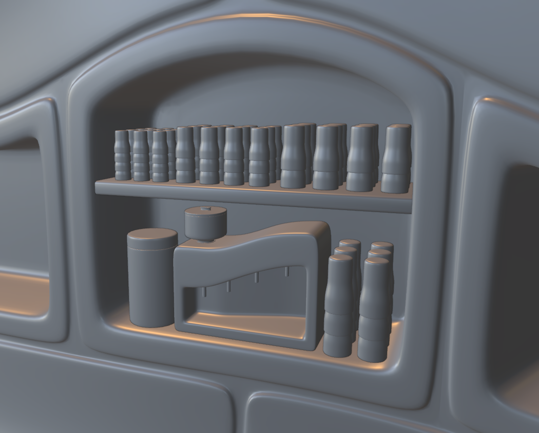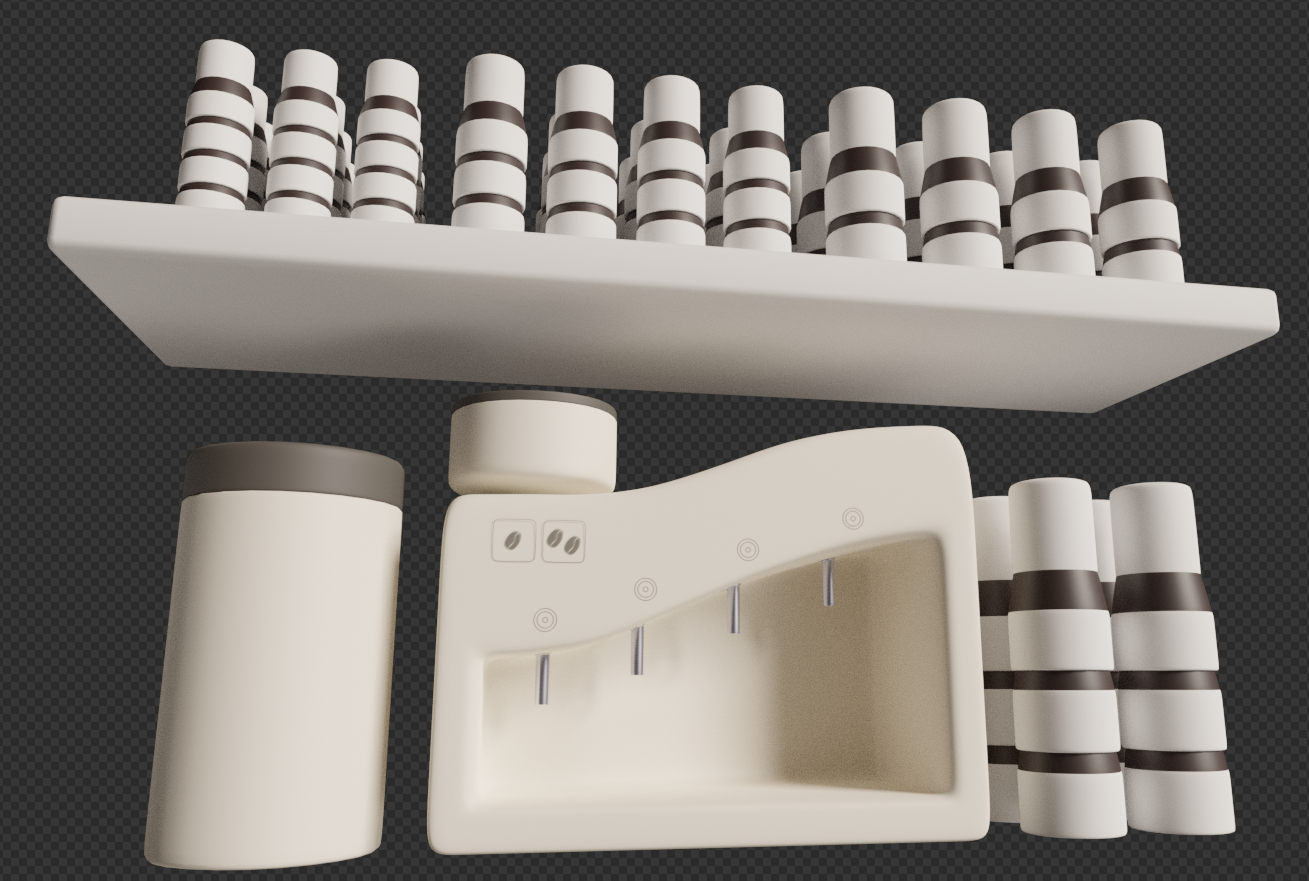 Tomorrow the final modeling (mostly bottles) and materials and friday is for the final tweaks and fixes and to start rendering (hopefully).