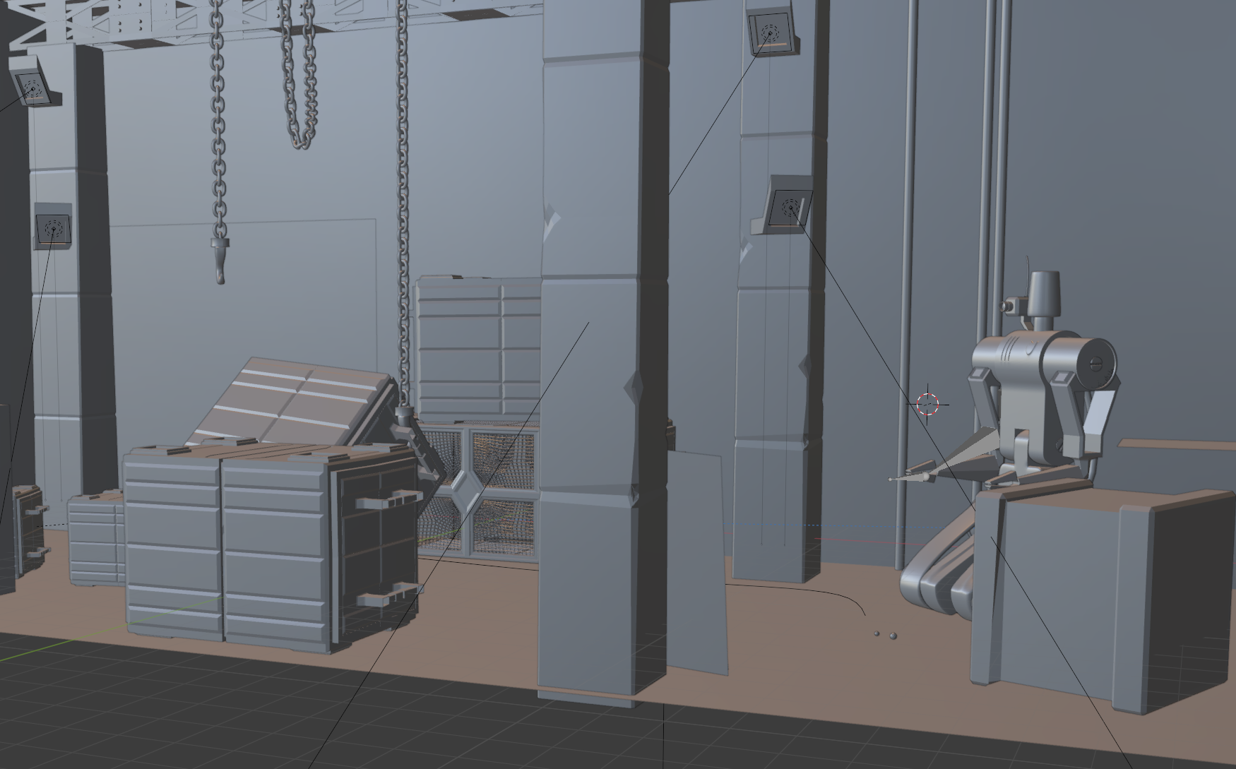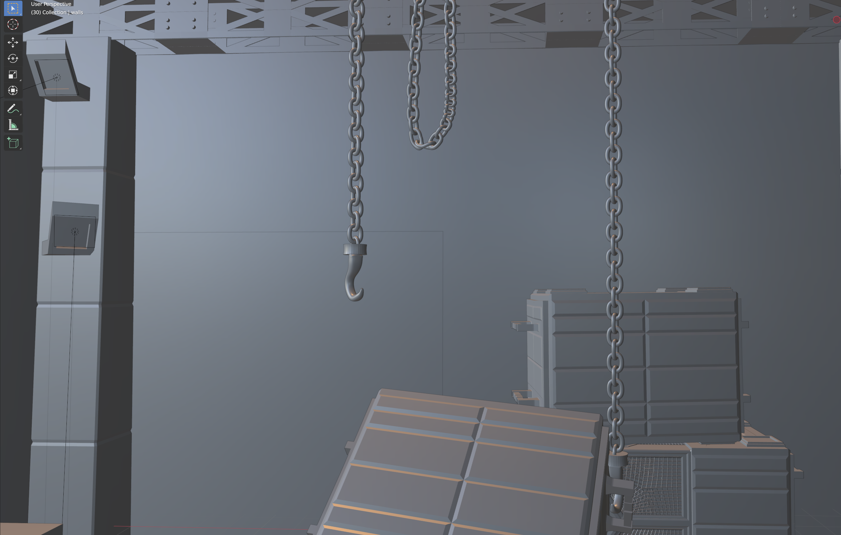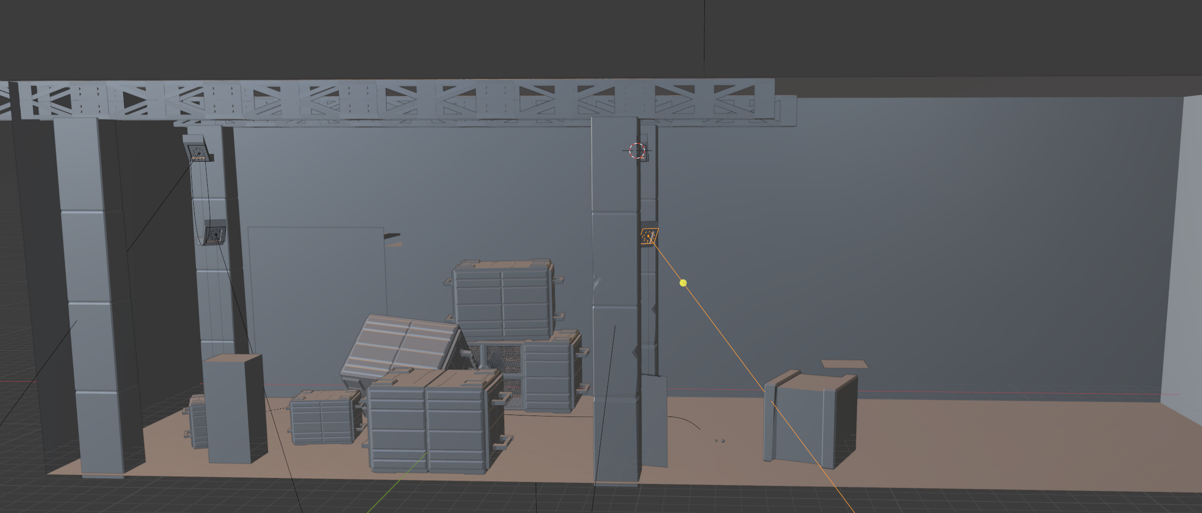 Step 2: preparing a room, here I felt like making a sci fi storage room that had some chaotic episode. a doorway is allready foreseen for the sci fi door. piled up some boxes , added a structure and added industrial lights. So far I'm in the post apocalyptic mood.