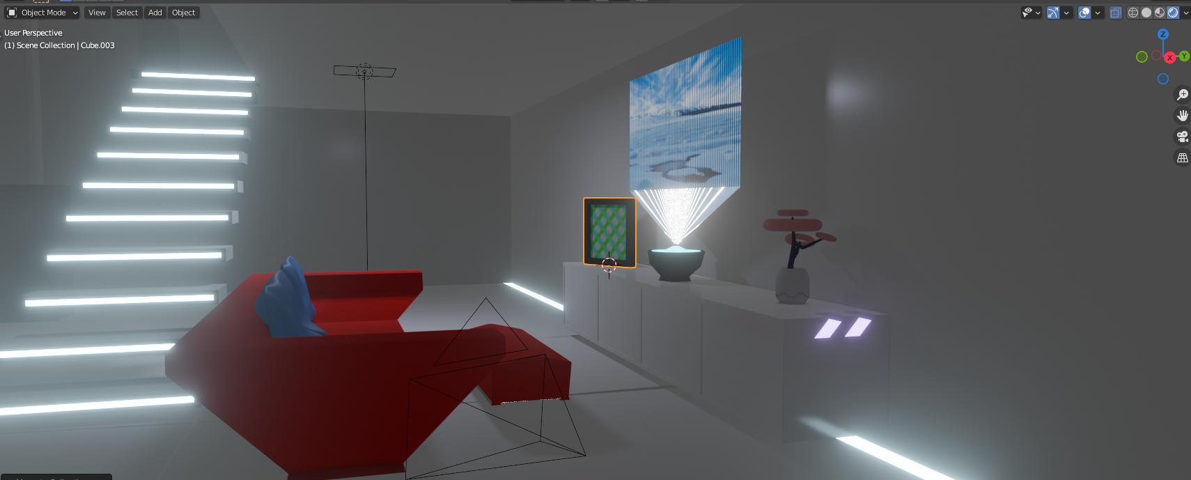Looking really nice. I especially like the placement of the lights, in the stairs and walls, and the holographic TV. Very cool sci-fi feel going on here. Nice work.