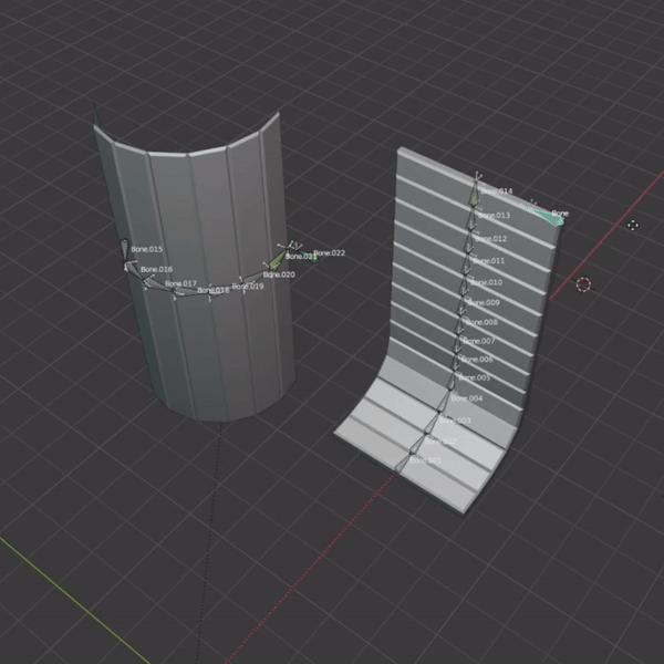 I'm happy with how the doors turned out and I feel like I got a little lucky with them. I knew what I wanted to end up with, but I didn't really know how to get there. I thought maybe the Spline IK Constraint could do what I wanted and I started playing around with that and was able to get it to work. A bone controls a shape key value on the spline, and then the door is deformed by a line of bones.