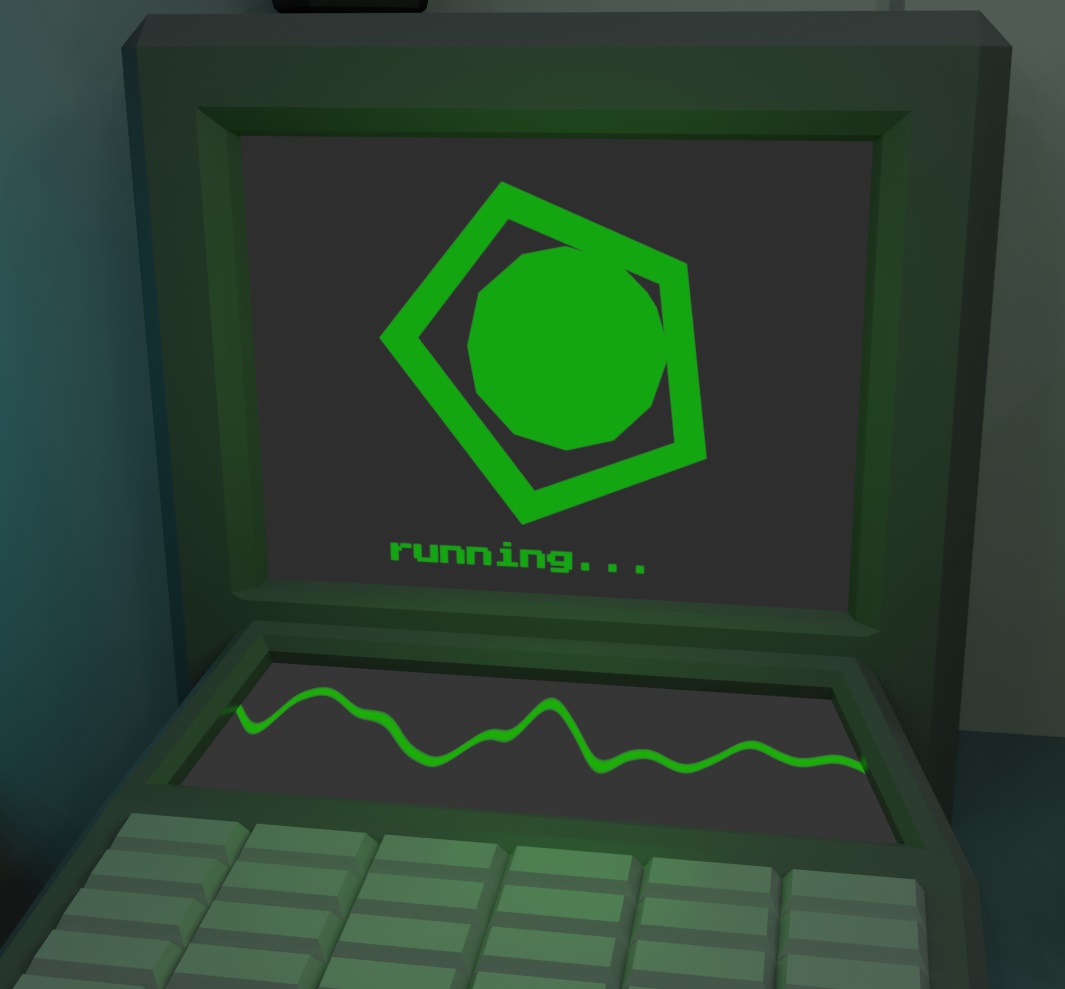I thought it would be cool if it looked like the computer was controlling the hologram, so I rendered out the primitives animation and an animated text object below it with a white emission shader in a black environment and then used that video as a mask for the screen of the computer.
